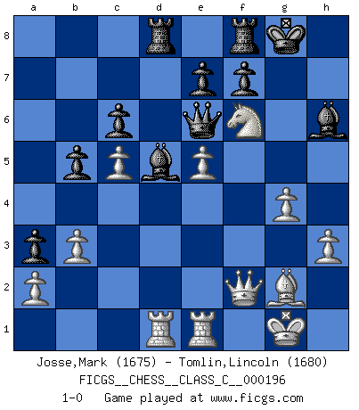 Last move : 1-0 2013 February 8 0:38:23 [Event "FICGS__CHESS__CLASS_C__000196"] [Site "FICGS"] [Date "2013.01.10"] [Round "1"] [White "Josse,Mark"] [Black "Tomlin,Lincoln"] [Result "1-0"] [WhiteElo "1675"] [BlackElo "1680"] 1.d4 d5 2.c4 c6 3.Nf3 Nf6 4.e3 Bf5 5.Nc3 a6 6.Qb3 b5 7.c5 a5 8.Ne5 a4 9.Qd1 g6 10.g4 Be6 11.Bg2 Bg7 12.O-O Qc8 13.h3 h5 14.f3 g5 15.e4 dxe4 16.Bxg5 Nbd7 17.Bxf6 Bxf6 18.Nxe4 Bg7 19.Re1 Nxe5 20.dxe5 a3 21.b3 Ra7 22.Ng3 Rd7 23.Qe2 hxg4 24.fxg4 Qc7 25.Kh1 Rd8 26.Rab1 Qc8 27.Kg1 Bh6 28.Qf3 Bd5 29.Ne4 O-O 30.Qf2 Qd7 31.Rbd1 Qe6 32.Nf6+ 1-0 Mark Josse i think you were better out of the opening not sure about ..h5 was not sure at all as it is difficult to assess until Nf6 appeared Lincoln Tomlin I play the Chebanenko OTB and it's an interesting game for me despite the loss. The plan with h5 still looks okay I think, I'm not sure why i decided to let you keep the e pawn on the board. Hmmm. Ra7 looks very dodgy with hindsight, Dropped pawn and wasting time, any compensation I thought was there soon evapourated. QGD Slav : 4.e3 Bf5 Kingside Castling by player White (move 12) Kingside Castling by player Black (move 29) Player White won this chess game. Follow this game move after move (download)The most important feature of the Chess position is the activity of the pieces. This is absolutely fundamental in all phases of the game: Opening, Middlegame and especially Endgame. The primary constraint on a piece's activity is the Pawn structure. (Michael Stean) Rubinstein ist ein Turmendspiel, welches die Götter vor tausenden von Jahren begannen. (Savielly Grigorievitsch Tartakower) Cuando veas una buena jugada, trata de encontrar otra mejor. (Emanuel Lasker) Ce qui est bien, c'est d'avoir tout un tas de pièces en prise : l'adversaire ne peut en prendre qu'une à la fois. Cité par Thierry Audin. Establishing goals is all right if you don't let them deprive you of interesting detours. (Doug Larson)
