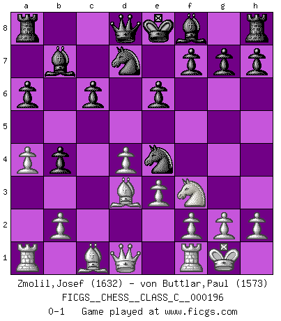 Last move : 0-1 2013 May 21 13:39:25 [Event "FICGS__CHESS__CLASS_C__000196"] [Site "FICGS"] [Date "2013.01.10"] [Round "1"] [White "Zmolil,Josef"] [Black "von Buttlar,Paul"] [Result "0-1"] [WhiteElo "1632"] [BlackElo "1573"] 1.c4 Nf6 2.Nc3 d5 3.d4 c6 4.Nf3 e6 5.e3 Nbd7 6.Bd3 dxc4 7.Bxc4 b5 8.Bd3 a6 9.a4 b4 10.Ne4 Bb7 11.O-O Nxe4 0-1 English : Anglo-Gruenfeld defense Kingside Castling by player White (move 11) Player Black won this chess game. Follow this game move after move (download)Life is a kind of Chess, with struggle, competition, good and ill events. (Benjamin Franklin) Fischer machte Schach einfach zu einer aufregenden Sache, wann immer er sich ans Brett setzte. (Raymond Keene) Una buena memoria, concentración, imaginación y una fuerte voluntad, se requiere para llegar a ser un buen jugador. (Bobby Fischer) Les sacrifices démontrent seulement que quelqu'un a gaffé. (Savielly Tartacover) You can only get smarter by playing a smarter opponent. (Revolver, movie)
