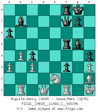 Last move : 0-1 2013 July 11 11:24:15 [Event "FICGS__CHESS__CLASS_C__000196"] [Site "FICGS"] [Date "2013.01.10"] [Round "1"] [White "Higuita,Henry"] [Black "Josse,Mark"] [Result "0-1"] [WhiteElo "1649"] [BlackElo "1675"] 1.e4 c5 2.Nf3 e6 3.Nc3 a6 4.a3 Nc6 5.d3 Be7 6.Be2 d6 7.O-O Nf6 8.Re1 O-O 9.h3 b5 10.Nh2 Bb7 11.Bf3 Qc7 12.Bf4 Nd7 13.Ne2 Nde5 14.Rc1 f5 15.exf5 Nxf3+ 16.Nxf3 Rxf5 17.Bg3 Raf8 18.Nd2 h5 19.f3 h4 20.Bh2 e5 21.Rf1 Bg5 22.Nc3 Nd4 23.Nce4 Bh6 24.Rb1 c4 25.dxc4 bxc4 26.Kh1 d5 27.Nc3 Bg5 28.Ne2 Ne6 29.c3 Nc5 30.Nc1 Qf7 31.b4 Ne4 32.Nxe4 dxe4 33.f4 exf4 34.Ne2 f3 35.gxf3 exf3 0-1 Sicilian defense Kingside Castling by player White (move 7) Kingside Castling by player Black (move 8) Player Black won this chess game. Follow this game move after move (download)Openings teach you openings. Endgames teach you chess ! (Stephan Gerzadowicz) Es ist besser die Steine des Gegners zu opfern. (Savielly Grigorievitsch Tartakower) Si el Ajedrez es una ciencia, es la mas inexacta. Si el Ajedrez es un arte, es demasiado inexacto para ser visto como tal. Si el Ajedrez es un deporte, es demasiado esotérico. Si el Ajedrez es un juego, es demasiado exigente para ser solo un juego. Si el Ajedrez es una aventura, es una muy demandante. Si el Ajedrez es una pasión, es una muy gratificante. Si el Ajedrez es la vida, es una muy triste. (Anónimo) Karpov est une pièce de musée. (Garry Kasparov) Crush them ! Make them suffer ! (General Grievous in Star Wars ep.3)
