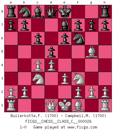 Last move : 1-0 2007 March 26 8:54:27 [Event "FICGS__CHESS__CLASS_C__000026"] [Site "FICGS"] [Date "2007.01.24"] [Round "1"] [White "Bullerkotte,Frank"] [Black "Campbell,Marcel"] [Result "1-0"] [WhiteElo "1700"] [BlackElo "1700"] 1.d4 Nf6 2.c4 e6 3.Nc3 c6 4.Nf3 d5 5.Bg5 Be7 6.e3 1-0 This chess game has been lost on time (started : 2007.01.24 15:56:56) Queen's pawn game Player White won this chess game. Follow this game move after move (download)You may learn much more from a game you lose than from a game you win. You will have to lose hundreds of games before becoming a good player. (Jose Raul Capablanca) In der Schule lernt man nichts. Es ist nur Zeitverschwendung. (Robert James Fischer) Vive, pierde y aprende al observar a tu oponente como ganar. (Amber Steenbock) Toutes choses étant égales, c'est la conviction qui gagne. Alliée à une volonté de vaincre, elle sert de détonateur, suscite des idées, disperse les doutes et aide à penser clairement. (Robert Fischer) There is a great deal of difference between an eager man who wants to read a book and a tired man who wants a book to read. (G.K. Chesterton)
