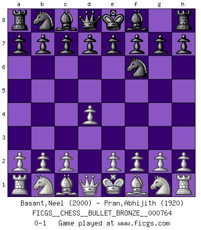 Last move : 0-1 2013 January 10 14:1:9 [Event "FICGS__CHESS__BULLET_BRONZE__000764"] [Site "FICGS"] [Date "2013.01.10"] [Round "1"] [White "Basant,Neel"] [Black "Pran,Abhijith"] [Result "0-1"] [WhiteElo "2000"] [BlackElo "1920"] 1.d4 Nf6 0-1 This chess game has been lost on time (started : 2013.01.10 13:50:4) Queen's pawn game Player Black won this chess game. Follow this game move after move (download)A big shock; the best chess player in history has passed away. (Lajos Portisch, about Bobby Fischer's death) Ich moechte nie einem Club beitreten, der Leute wie mich als Mitglieder aufnimmt. (Woody Allen) Cuando veas una buena jugada, trata de encontrar otra mejor. (Emanuel Lasker) La guerre est enfant de la passion, la passion est enfant du narcissisme et le narcissisme est l'enfant. (...) Une autre partie ? (Thibault de Vassal) Perception is reality. (Immanuel Kant)