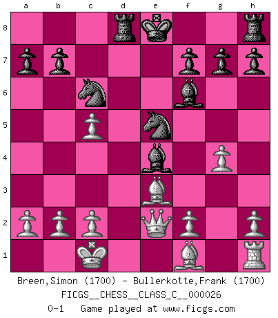 Last move : 0-1 2007 May 19 22:10:18 [Event "FICGS__CHESS__CLASS_C__000026"] [Site "FICGS"] [Date "2007.01.24"] [Round "1"] [White "Breen,Simon"] [Black "Bullerkotte,Frank"] [Result "0-1"] [WhiteElo "1700"] [BlackElo "1700"] 1.e4 c6 2.d4 d5 3.e5 Bf5 4.Nc3 e6 5.g4 Bg6 6.Nge2 c5 7.Be3 Nc6 8.dxc5 Nxe5 9.Nf4 Ne7 10.Qe2 N7c6 11.O-O-O Be7 12.Nfxd5 exd5 13.Nxd5 Be4 14.Nf6+ Bxf6 15.Rxd8+ Rxd8 0-1 This chess game has been lost on time (started : 2007.01.24 15:56:56) Caro-Kann : Advance variation Queenside Castling by player White (move 11) Player Black won this chess game. Follow this game move after move (download)Look at Garry Kasparov. After he loses, invariably he wins the next game. He just kills the next guy. That's something that we have to learn to be able to do. (Maurice Ashley) Besser ein falscher Plan, logisch durchgeführt, als gar kein Plan. (Viktor Kortschnoi) Un juego de Ajedrez es un dialogo, una conversación entre un jugador y su oponente. Cada movimiento del oponente puede contener amenazas o tropiezos, pero un jugador no se puede defender de las amenazas o tomar ventaja de los tropiezos si es que no se pregunta a sí mismo: ¿Que es lo que mi oponente va a hacer después de cada movida?. (Bruce A. Moon) Il n'y a plus de joueurs du niveau de Jacob Murray dont la seule quête est le beau jeu, le plaisir de voir les pièces construire quelque chose. Sur 10 idées à la minute, 9 seront sans intérêt, la dernière s'avèrera géniale. (Christian Bauer) Being number two sucks. (Andre Agassi)