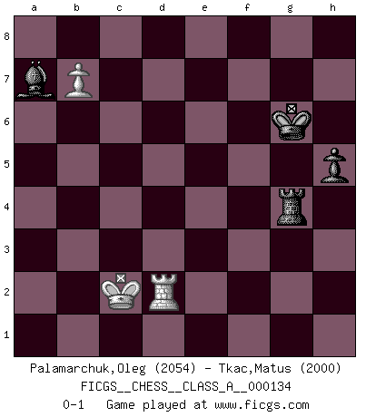 Last move : 0-1 2013 September 7 15:59:19 [Event "FICGS__CHESS__CLASS_A__000134"] [Site "FICGS"] [Date "2013.01.12"] [Round "1"] [White "Palamarchuk,Oleg"] [Black "Tkac,Matus"] [Result "0-1"] [WhiteElo "2054"] [BlackElo "2000"] 1.d4 Nf6 2.c4 e6 3.Nf3 b6 4.Nc3 Bb4 5.e3 Bb7 6.Bd3 c5 7.O-O O-O 8.Na4 cxd4 9.exd4 Bd6 10.Nc3 Nc6 11.a3 Rc8 12.b4 a5 13.Nb5 Bb8 14.Rb1 d5 15.c5 Ne4 16.Qc2 f5 17.Be3 Qf6 18.Rfe1 g5 19.Bxe4 fxe4 20.Nxg5 axb4 21.axb4 Ba6 22.Qa4 Bxb5 23.Qxb5 h6 24.Nh3 bxc5 25.dxc5 Qe5 26.g3 Qh5 27.Qf1 Ne5 28.Red1 Nf3+ 29.Kh1 Be5 30.Qg2 Rc7 31.Ng1 d4 32.Bd2 e3 33.fxe3 Rg7 34.Qh3 Qg6 35.Nxf3 Rxf3 36.Rf1 dxe3 37.Rxf3 Qxb1+ 38.Be1 Qxe1+ 39.Rf1 Qe2 40.Qxe6+ Kh7 41.Qf5+ Rg6 42.c6 Qb5 43.Rc1 Qd5+ 44.Kg1 Kg7 45.Rc5 Qd1+ 46.Kg2 Rf6 47.Qd7+ Qxd7 48.cxd7 Rf2+ 49.Kh3 Bf6 50.Re5 e2 51.Re4 Bg5 52.b5 Bd8 53.Kg4 Rxh2 54.Kf3 Rh5 55.Kxe2 Rd5 56.Re3 Rxd7 57.Rd3 Re7+ 58.Kf3 Ba5 59.Rd5 Rb7 60.Ke4 Bb4 61.Kd4 Kf6 62.Kc4 Be1 63.Rh5 Bd2 64.Rd5 Be3 65.Kd3 Re7 66.g4 Bg1 67.Rf5+ Kg6 68.Rd5 Re3+ 69.Kc2 Rg3 70.b6 Rxg4 71.Rd2 h5 72.b7 Ba7 0-1 Queen's Indian : 4.Nc3 Kingside Castling by player White (move 7) Kingside Castling by player Black (move 7) 10 pieces endgame at move 53 : White KRPPP , Black KRBPP WHITE : King + 1 Rook 3 Pawns BLACK : King + 1 Rook 1 Bishop 2 Pawns 9 pieces endgame at move 55 : White KRPPP , Black KRBP WHITE : King + 1 Rook 3 Pawns BLACK : King + 1 Rook 1 Bishop 1 Pawn 8 pieces endgame at move 56 : White KRPP , Black KRBP WHITE : King + 1 Rook 2 Pawns BLACK : King + 1 Rook 1 Bishop 1 Pawn 7 pieces endgame at move 70 : White KRP , Black KRBP WHITE : King + 1 Rook 1 Pawn BLACK : King + 1 Rook 1 Bishop 1 Pawn Player Black won this chess game. Follow this game move after move (download)Though most people love to look at the games of the great attacking masters, some of the most successful players in history have been the quiet positional players. They slowly grind you down by taking away your space, tying up your pieces, and leaving you with virtually nothing to do ! (Yasser Seirawan) Kein Schachspieler kann gut schlafen. (H. G. Wells) Un Peón pasado aumenta su poder a medida de que el número de piezas en el tablero disminuye. (Capablanca) Comme les marins qui ont mille raisons différentes d'aller en mer, les joueurs d'échecs en ont tout autant avant de s'installer devant une table et jouer... (Vincent Bertignac, philosophe) When you have everything, sometimes it feels like nothing. (Horatio Caine, C.S.I. Miami)