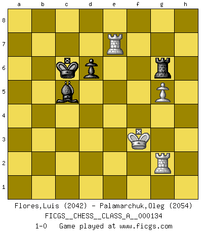 Last move : 1-0 2013 September 13 7:23:57 [Event "FICGS__CHESS__CLASS_A__000134"] [Site "FICGS"] [Date "2013.01.12"] [Round "1"] [White "Flores,Luis"] [Black "Palamarchuk,Oleg"] [Result "1-0"] [WhiteElo "2042"] [BlackElo "2054"] 1.e4 c5 2.Nf3 d6 3.d4 cxd4 4.Nxd4 Nf6 5.Nc3 a6 6.Be3 g6 7.f3 Bg7 8.Qd2 Nbd7 9.g4 b5 10.O-O-O Bb7 11.h4 Ne5 12.h5 Rc8 13.Be2 Rg8 14.Kb1 Nfd7 15.Nd5 Nc4 16.Bxc4 bxc4 17.c3 Rb8 18.Rh2 Ne5 19.Bg5 Bf8 20.hxg6 hxg6 21.Ka1 Nd3 22.Qc2 Bxd5 23.exd5 Qd7 24.Rb1 Rb6 25.Qe2 Qb7 26.Nc6 Rxc6 27.dxc6 Qxc6 28.b3 Kd7 29.Rh7 Ne5 30.f4 Qf3 31.Qxf3 Nxf3 32.Rxf7 Nxg5 33.fxg5 cxb3 34.Rh7 Ke6 35.Re1+ Kd7 36.axb3 Bg7 37.Kb2 Be5 38.Ra1 Rf8 39.Rxa6 Rf3 40.Ra7+ Kc6 41.Raxe7 Bxc3+ 42.Ka3 Bd4 43.Rh6 Bc5+ 44.Kb2 Bd4+ 45.Kc2 Rc3+ 46.Kd1 Rxb3 47.Rxg6 Rb4 48.Rh6 Bc5 49.Rh4 Bf2 50.Rh2 Bc5 51.Rg2 Rb1+ 52.Ke2 Rb8 53.g6 Rg8 54.g5 Rxg6 55.Kf3 1-0 Sicilian : Najdorf, Byrne (English) attack Queenside Castling by player White (move 10) 10 pieces endgame at move 46 : White KRRPP , Black KRBPP WHITE : King + 2 Rooks 2 Pawns BLACK : King + 1 Rook 1 Bishop 2 Pawns 9 pieces endgame at move 47 : White KRRPP , Black KRBP WHITE : King + 2 Rooks 2 Pawns BLACK : King + 1 Rook 1 Bishop 1 Pawn 8 pieces endgame at move 54 : White KRRP , Black KRBP WHITE : King + 2 Rooks 1 Pawn BLACK : King + 1 Rook 1 Bishop 1 Pawn Player White won this chess game. Follow this game move after move (download)We like to think. (Gary Kasparov) Wer nie einen Fehler gemacht hat, hat nie etwas Neues ausprobiert. (Albert Einstein) La caracteristica mas importante en la posición del Ajedrez es la actividad de las piezas. Esto es absolutamente fundamental en todas las fases del juego: Apertura, Juego Medio y especialmente Finales. La limitación primordial en la actividad de una pieza, es la estructuración de los Peones. (Michael Stean) Horreur, mais aussi harmonie suprême : qu'y avait-il en effet au monde en dehors des échecs ? Le brouillard, l'inconnu, le non-être... (Vladimir Nabokov) It's unlucky to be superstitious. (Dave Enteles)