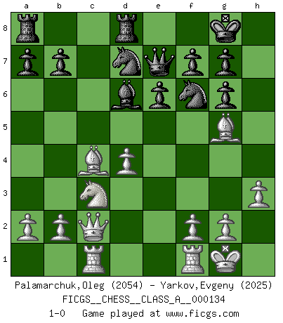 Last move : 1-0 2013 May 13 15:35:33 [Event "FICGS__CHESS__CLASS_A__000134"] [Site "FICGS"] [Date "2013.01.12"] [Round "1"] [White "Palamarchuk,Oleg"] [Black "Yarkov,Evgeny"] [Result "1-0"] [WhiteElo "2054"] [BlackElo "2025"] 1.d4 d5 2.Nf3 Nf6 3.c4 c6 4.e3 Bf5 5.Nc3 e6 6.Nh4 Bg6 7.Nxg6 hxg6 8.Bd2 Nbd7 9.Qc2 Bd6 10.Be2 Qe7 11.h3 dxc4 12.Bxc4 O-O 13.O-O c5 14.Rac1 cxd4 15.exd4 Rfd8 16.Bg5 1-0 This chess game has been lost on time (started : 2013.01.12 22:18:37) Queen's pawn game Kingside Castling by player Black (move 12) Kingside Castling by player White (move 13) Player White won this chess game. Follow this game move after move (download)Could we look into the head of a Chess player, we should see there a whole world of feelings, images, ideas, emotion and passion. (Alfred Binet) Es ist besser die Steine des Gegners zu opfern. (Savielly Grigorievitsch Tartakower) Debes de llevar a tu oponente hacia un profundo y obscuro bosque donde 2+2=5, y el camino que conduce a la salida es suficientemente ancho para solamente uno. (Mikhail Tal) Shah mat. Le roi est mort. Cri de fierté d'un joueur venant de terrasser son adversaire, courtoisement, sans effusion de sang. In my experience, there's no such thing as luck. (Obi-Wan Kenobi in Star Wars ep.4)