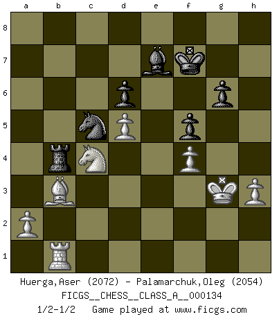 Last move : 1/2-1/2 2013 February 24 23:19:28 [Event "FICGS__CHESS__CLASS_A__000134"] [Site "FICGS"] [Date "2013.01.12"] [Round "1"] [White "Huerga,Aser"] [Black "Palamarchuk,Oleg"] [Result "1/2-1/2"] [WhiteElo "2072"] [BlackElo "2054"] 1.e4 c5 2.Nf3 d6 3.d4 cxd4 4.Nxd4 Nf6 5.Nc3 a6 6.f3 e5 7.Nb3 Be6 8.Be3 h5 9.Nd5 Bxd5 10.exd5 g6 11.Qd2 Nbd7 12.Be2 Bg7 13.O-O b6 14.c4 h4 15.Rae1 O-O 16.Bg5 h3 17.gxh3 Qc7 18.Kh1 Nh5 19.Rg1 Rfe8 20.Bd3 Ndf6 21.h4 Qd7 22.Qe3 Rab8 23.Nd2 b5 24.b3 bxc4 25.Bxc4 Kh7 26.Rc1 Rh8 27.Rc2 Kg8 28.Rgc1 Nf4 29.Bxf4 exf4 30.Qxf4 a5 31.Re1 Rh5 32.Nf1 Rf5 33.Qg3 a4 34.Ne3 Nh5 35.Qg4 axb3 36.Bxb3 Nf6 37.Qh3 Rh5 38.Qxd7 Nxd7 39.Nc4 Bf8 40.Nd2 Rxh4 41.Rc4 Rxc4 42.Nxc4 Nc5 43.Rb1 f5 44.Kg2 Rb4 45.Kg3 Kf7 46.h3 Be7 47.f4 1/2-1/2 Sicilian : Najdorf Kingside Castling by player White (move 13) Kingside Castling by player Black (move 15) This chess game ended in a draw. Follow this game move after move (download)The game of chess is the touchstone of the intellect. (Goethe) Obwohl ich alt bin, darf mir niemand den Finger in den Mund stecken, sonst beisse ich. (Wilhelm Steinitz) Aquel que toma al Peón de Caballo de la Reina, se pasará la noche a dormir en la calle. (Anónimo) J'apprécie les joueurs d'est-indienne, c'est grâce à eux que je nourris ma famille depuis tant d'années. (Petrosian) Never risk one's whole fortune unless supported by one's entire army. (Niccolo Machiavelli)