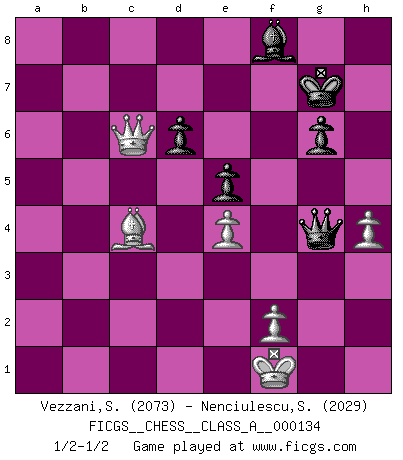 Last move : 1/2-1/2 2013 June 27 10:19:25 [Event "FICGS__CHESS__CLASS_A__000134"] [Site "FICGS"] [Date "2013.01.12"] [Round "1"] [White "Vezzani,Stefano"] [Black "Nenciulescu,Silviu"] [Result "1/2-1/2"] [WhiteElo "2073"] [BlackElo "2029"] 1.e4 c5 2.Nf3 d6 3.c3 Nf6 4.d3 g6 5.g3 Bg7 6.Bg2 Nc6 7.O-O O-O 8.Re1 e5 9.Na3 Re8 10.Bg5 h6 11.Bxf6 Bxf6 12.Nc2 Be6 13.a3 b5 14.b4 Qd7 15.Qd2 Bg7 16.Reb1 Reb8 17.Qe3 Rb6 18.Bf1 Rc8 19.Qe1 a5 20.a4 cxb4 21.cxb4 bxa4 22.b5 Na7 23.Qxa5 Rxb5 24.Rxb5 Nxb5 25.Qxa4 Rc7 26.Qa8+ Kh7 27.Ne3 Nc3 28.Qa3 f5 29.Nd2 Nb5 30.Qa8 f4 31.Nec4 Nd4 32.Qb8 Qe7 33.Ra6 Bf8 34.Ra8 Rc8 35.Qa7 Rxa8 36.Qxa8 Kg8 37.Kg2 Qg5 38.Qe8 Bf7 39.Qa8 Bxc4 40.dxc4 fxg3 41.hxg3 Qxd2 42.Qd5+ Kg7 43.c5 Qc3 44.Bc4 Qf3+ 45.Kg1 h5 46.c6 Nxc6 47.Qxc6 h4 48.gxh4 Qg4+ 49.Kf1 1/2-1/2 Sicilian Kingside Castling by player White (move 7) Kingside Castling by player Black (move 7) This chess game ended in a draw. Follow this game move after move (download)Chess is imagination. (David Bronstein) Lisa Lane, amerikanische Schachmeisterin, hatte Fischer einmal als stärksten lebenden Spieler bezeichnet. Antwort: Das ist richtig, aber Lisa Lane ist eigentlich nicht in der Lage, das zu beurteilen. (Robert James Fischer) Un entendimiento a fondo de las continuaciones típicas del mate, hace de las combinaciones de sacrificio mas complicadas conducirlas a ellas no solo sin dificultad, sino casi de una manera natural. (Siegbert Tarrasch) On est toujours la mazette de quelqu'un d'autre. (Anonyme) Unless I accept my faults I will most certainly doubt my virtues. (Hugh Prather)