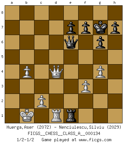 Last move : 1/2-1/2 2013 January 23 21:15:46 [Event "FICGS__CHESS__CLASS_A__000134"] [Site "FICGS"] [Date "2013.01.12"] [Round "1"] [White "Huerga,Aser"] [Black "Nenciulescu,Silviu"] [Result "1/2-1/2"] [WhiteElo "2072"] [BlackElo "2029"] 1.e4 c5 2.Nf3 d6 3.d4 cxd4 4.Nxd4 Nf6 5.Nc3 g6 6.Be3 Bg7 7.f3 Nc6 8.Qd2 O-O 9.O-O-O d5 10.exd5 Nxd5 11.Nxc6 bxc6 12.Nxd5 cxd5 13.Qxd5 Qc7 14.Qc5 Qb7 15.b3 Bf5 16.Bd3 Rac8 17.Qa5 Rc3 18.Bxf5 Rxe3 19.Be4 Qc8 20.g4 Qb8 21.Kb1 Qf4 22.Rd8 Bc3 23.Rxf8+ Kxf8 24.Qxa7 Re2 25.a3 Qxh2 26.Rd1 Qd6 27.Bd3 Re5 28.b4 Kg7 29.Be2 Qe6 30.Qc7 Bxb4 31.axb4 Rxe2 32.Qd7 Re1 33.Qd4+ 1/2-1/2 Sicilian : Dragon, Yugoslav attack Kingside Castling by player Black (move 8) Queenside Castling by player White (move 9) This chess game ended in a draw. Follow this game move after move (download)You need not play well - just help your opponent to play badly. (Genrikh Chepukaitis) Ich hatte meine größten Erfolge, als ich 47 Jahre alt war. Kasparow war noch nicht mal 42 und hat das Schach schon im Stich gelassen. (Viktor Kortschnoi) Fischer deseaba darle a los Rusos una sopa de su propia medicina. (Larry Evans) Le génie consiste à savoir transgresser les règles au moment opportun. (Teichmann) Gambling is the son of avarice and the father of despair. (French proverb)