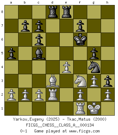 Last move : 0-1 2013 May 14 10:42:1 [Event "FICGS__CHESS__CLASS_A__000134"] [Site "FICGS"] [Date "2013.01.12"] [Round "1"] [White "Yarkov,Evgeny"] [Black "Tkac,Matus"] [Result "0-1"] [WhiteElo "2025"] [BlackElo "2000"] 1.e4 e5 2.Nf3 Nc6 3.d4 exd4 4.Nxd4 Bc5 5.Nxc6 Qf6 6.Qf3 dxc6 7.Bc4 Qe7 8.Bf4 Nf6 9.O-O Bg4 10.Qg3 h5 11.Bg5 h4 12.Qxg4 Nxg4 13.Bxe7 Kxe7 14.Nd2 Rad8 15.Nf3 h3 16.Bd3 g5 17.g3 Kf6 18.Rad1 Rhe8 19.Rd2 a5 0-1 This chess game has been lost on time (started : 2013.01.12 22:18:37) Scotch game Kingside Castling by player White (move 9) Player Black won this chess game. Follow this game move after move (download)Winning isn't everything... but losing is nothing. (Mednis) Das ganze Leben mit einer Ehefrau ist wie ein Endspiel mit ungleichfarbigen Läufern. (Viktor Kortschnoi) El Jaque al descubierto es el bombardero del tablero. (Reuben Fine) Je ne crois pas en la psychologie, je crois aux bons coups. (Robert Fischer) First of all, we have to go back to the classical time control. (Anatoly Karpov)