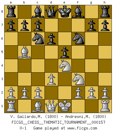Last move : 0-1 2013 February 24 4:15:20 [Event "FICGS__CHESS__THEMATIC_TOURNAMENT__000157"] [Site "FICGS"] [Date "2013.01.13"] [Round "1"] [White "V. Gallardo,Miguel"] [Black "Andreoni,Mario"] [Result "0-1"] [WhiteElo "1800"] [BlackElo "1800"] 1.e4 e5 2.Nf3 Nc6 3.Bb5 f5 4.Nc3 fxe4 5.Nxe4 Nf6 6.d3 d6 0-1 This chess game has been lost on time (started : 2013.01.13 18:3:27) Ruy Lopez : Schliemann defense, Berger variation Player Black won this chess game. Follow this game move after move (download)Chess is a beautiful mistress. (Bent Larsen) Woher wissen wir, daß der Neanderthaler Blindschach gespielt hat? -- Bei Ausgrabungen wurden keine Schachbretter und Figuren gefunden. (Anonymous) Aquellos que dicen entender al Ajedrez, no entienden nada. (Robert Hubner) Mon pion favori sur ma case favorite ! Bronstein en parlant d'un coup de pion en h5 quand il avait les Noirs. I think your argument is specious - I think your tie is ugly. (Gregory House to Dr. Foreman, House M.D.)
