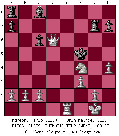 Last move : 1-0 2013 May 21 18:33:40 [Event "FICGS__CHESS__THEMATIC_TOURNAMENT__000157"] [Site "FICGS"] [Date "2013.01.13"] [Round "1"] [White "Andreoni,Mario"] [Black "Bain,Mathieu"] [Result "1-0"] [WhiteElo "1800"] [BlackElo "1557"] 1.e4 e5 2.Nf3 Nc6 3.Bb5 f5 4.d3 fxe4 5.dxe4 Bc5 6.Bxc6 bxc6 7.Nxe5 Qf6 8.Nd3 Qd4 9.O-O Nf6 10.Be3 Qxe4 11.Bxc5 d6 12.Re1 Qxe1+ 13.Qxe1+ Kf7 14.Bd4 Re8 15.Qa5 Nd5 16.Nc3 Nxc3 17.Bxc3 Re7 18.Qg5 Kf8 19.Bxg7+ Rxg7 20.Qd8+ Kf7 21.Qxc7+ Kg6 22.Qxd6+ Kg5 23.h4+ Kh5 24.Nf4+ Kg4 25.f3+ Kf5 26.Re1 1-0 Ruy Lopez : Schliemann defense Kingside Castling by player White (move 9) Player White won this chess game. Follow this game move after move (download)Chess is a part of culture and if a culture is declining then Chess too will decline. (Mikhail Botvinnik) Jeder Fehler erscheint unglaublich dumm, wenn andre ihn begehen. (Georg Christoph Lichtenberg) Coloca el contenido del tablero de Ajedrez en un sombrero, agita las piezas vigorosamente, derrámalas en el tablero desde una altura de medio metro y así obtienes el estilo de Wilhelm Steinitz. (H. E. Bird) Tous ces prétendus hommes politiques sont les pions, les Cavaliers, les Tours ou les Fous d'une partie d'échecs qui se jouera tant qu'un hasard ne renversera pas l'échiquier. (Honoré de Balzac) Any activity becomes creative when the doer cares about doing it right or doing it better. (John Updike)