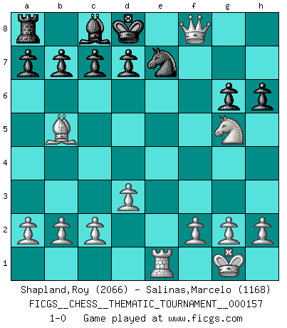 Last move : 1-0 2013 April 1 23:38:49 [Event "FICGS__CHESS__THEMATIC_TOURNAMENT__000157"] [Site "FICGS"] [Date "2013.01.13"] [Round "1"] [White "Shapland,Roy"] [Black "Salinas,Marcelo"] [Result "1-0"] [WhiteElo "2066"] [BlackElo "1168"] 1.e4 e5 2.Nf3 Nc6 3.Bb5 f5 4.Nc3 fxe4 5.Nxe4 Nd4 6.Nxd4 exd4 7.O-O Qh4 8.d3 Bb4 9.Bg5 Qxg5 10.Nxg5 Ne7 11.Qh5+ g6 12.Qh4 Nf5 13.Rae1+ Be7 14.Rxe7+ Nxe7 15.Re1 h6 16.Qxd4 Rg8 17.Qe5 Rg7 18.Qxg7 Kd8 19.Qf8+ 1-0 Ruy Lopez : Schliemann defense, Berger variation Kingside Castling by player White (move 7) Player White won this chess game. Follow this game move after move (download)Some sacrifices are sound; the rest are mine. (Mikhail Tal) Was ist der Unterschied zwischen einem Strassenarbeiter und einem Schachspieler? --Der Schachspieler bewegt sich ab und zu. (Anonymous) El Jaque al descubierto es el bombardero del tablero. (Reuben Fine) Un journaliste : 'Vous préférez avoir une dame de plus sur l'échiquier ou au lit ?' Boris Spassky : 'Ca dépend de la position.' 'preceded by its own quotation yields a falsehood' preceded by its own quotation yields a falsehood. (W. V. O. Quine - Set Theory And Its Logic, 1953)