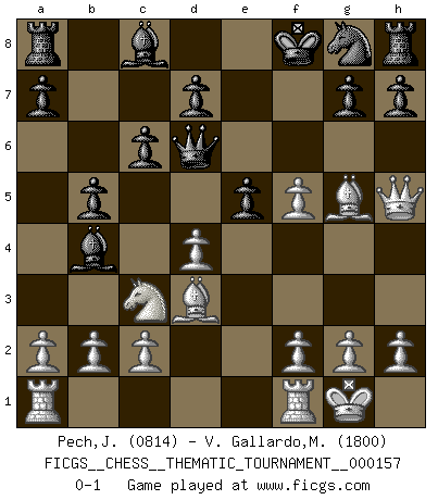 Last move : 0-1 2013 May 26 12:6:53 [Event "FICGS__CHESS__THEMATIC_TOURNAMENT__000157"] [Site "FICGS"] [Date "2013.01.13"] [Round "1"] [White "Pech,Jaroslav"] [Black "V. Gallardo,Miguel"] [Result "0-1"] [WhiteElo "0814"] [BlackElo "1800"] 1.e4 e5 2.Nf3 Nc6 3.Bb5 f5 4.Nc3 Nd4 5.exf5 Nxf3+ 6.Qxf3 Qf6 7.d4 c6 8.Bd3 Bb4 9.Qh5+ Kf8 10.Bg5 Qd6 11.O-O b5 0-1 Ruy Lopez : Schliemann defense, Berger variation Kingside Castling by player White (move 11) Player Black won this chess game. Follow this game move after move (download)Chess opens and enriches your mind. (Saudin Robovic) Wenn es im Universum noch irgendwo intelligente Lebewesen gibt, dann kennen sie Go. (Emanuel Lasker) Los problemas de Ajedrez exigen del compositor las mismas virtudes que caracterizan todo el arte de valor: originalidad, invención, concisión, armonía, complejidad e insinceridad explendida. (Vladimir Nabokov) Je ne crois pas en la psychologie, je crois aux bons coups. (Robert Fischer) Control your own destiny or someone else will. (Jack Welch)