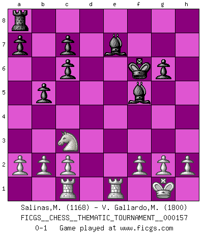 Last move : 0-1 2013 May 24 4:34:57 [Event "FICGS__CHESS__THEMATIC_TOURNAMENT__000157"] [Site "FICGS"] [Date "2013.01.13"] [Round "1"] [White "Salinas,Marcelo"] [Black "V. Gallardo,Miguel"] [Result "0-1"] [WhiteElo "1168"] [BlackElo "1800"] 1.e4 e5 2.Nf3 Nc6 3.Bb5 f5 4.Bxc6 dxc6 5.Nxe5 Nf6 6.d3 Bd6 7.Bf4 fxe4 8.dxe4 Nxe4 9.Qh5+ g6 10.Nxg6 hxg6 11.Qxh8+ Bf8 12.O-O Qf6 13.Qxf6 Nxf6 14.Re1+ Be7 15.Bg5 Kf7 16.Nc3 Bf5 17.Bxf6 Kxf6 18.Rac1 b5 0-1 This chess game has been lost on time (started : 2013.01.13 18:3:27) Ruy Lopez : Schliemann defense Kingside Castling by player White (move 12) Player Black won this chess game. Follow this game move after move (download)When asked, -How is that you pick better moves than your opponents?, I responded: I'm very glad you asked me that, because, as it happens, there is a very simple answer. I think up my own moves, and I make my opponent think up his. (Alexander Alekhine) Es ist schade, dass viele Schachsportler vergessen, wie wichtig Auftreten und angemessene Kleidung sind. (Alexandra Kosteniuk) El sobresalir en el Ajedrez es un signo de una mente intrigante. (Sir Arthur Conan Doyle) A ce moment-là, je menaçais de comprendre la position ! (Clément L'Heureux) Indecision is the key to flexibility. (Unknown)