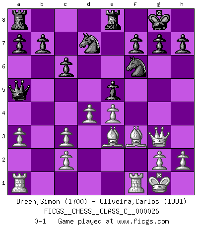Last move : 0-1 2007 May 16 21:25:47 [Event "FICGS__CHESS__CLASS_C__000026"] [Site "FICGS"] [Date "2007.01.24"] [Round "1"] [White "Breen,Simon"] [Black "Oliveira,Carlos"] [Result "0-1"] [WhiteElo "1700"] [BlackElo "1981"] 1.e4 c6 2.d4 d6 3.Nc3 Qc7 4.f4 e5 5.Nf3 Bg4 6.Be2 Nf6 7.fxe5 Bxf3 8.Bxf3 dxe5 9.Be3 Bb4 10.a3 Bxc3+ 11.bxc3 O-O 12.O-O Nbd7 13.Qe1 Rfe8 14.Qg3 Qa5 0-1 This chess game has been lost on time (started : 2007.01.24 15:56:56) Caro-Kann defense Kingside Castling by player Black (move 11) Kingside Castling by player White (move 12) Player Black won this chess game. Follow this game move after move (download)A good sacrifice is one that is not necessarily sound but leaves your opponent dazed and confused. (Rudolph Spielmann) Es gibt Leute, die glauben, alles wäre vernünftig, was man mit einem ernsthaften Gesicht tut. (Georg Christoph Lichtenberg) Ser exitoso en el Ajedrez te permite descubrir tu propia personalidad. Eso es lo que deseo para los niños de mi clase. (Saudin Robovic) Les échecs sont utiles à l'exercice de la faculté de penser et à celle de l'imagination. Car nous devons posséder une méthode élaborée pour atteindre des buts partout où nous devons conduire notre raison. (Leibnitz) Hold em is to stud what chess is to checkers. (Johnny Moss)