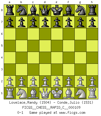 Last move : 0-1 2013 February 13 2:46:0 [Event "FICGS__CHESS__RAPID_C__000109"] [Site "FICGS"] [Date "2013.01.13"] [Round "1"] [White "Lovelace,Randy"] [Black "Conde,Julio"] [Result "0-1"] [WhiteElo "1504"] [BlackElo "1531"] 0-1 This chess game has been lost on time (started : 2013.01.13 18:6:21) Player Black won this chess game. Follow this game move after move (download)It is not a move, even the best move that you must seek, but a realizable plan. (Eugene Znosko-Borovsky) Besser ein falscher Plan, logisch durchgeführt, als gar kein Plan. (Viktor Kortschnoi) Dios mío, Bobby Fischer juega tan simple. (Alexei Suetin) Une platitude souvent récitée à propos des Echecs est qu'une des choses les plus difficiles à réaliser est de gagner une position gagnante. Cela ne manque pas de sens mais, pour ma part, j'ai toujours trouvé plus difficile de gagner une position perdante. (Tim Krabbe) Now be brave and don't look back. Don't look back. (Shmi Skywalker in Star Wars ep.1)