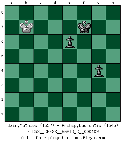Last move : 0-1 2013 March 25 13:3:30 [Event "FICGS__CHESS__RAPID_C__000109"] [Site "FICGS"] [Date "2013.01.13"] [Round "1"] [White "Bain,Mathieu"] [Black "Archip,Laurentiu"] [Result "0-1"] [WhiteElo "1557"] [BlackElo "1645"] 1.e4 d5 2.exd5 Qxd5 3.Nc3 Qd8 4.Nf3 Nf6 5.Bb5+ Bd7 6.Bc4 e6 7.Qe2 Bb4 8.a3 Bxc3 9.dxc3 O-O 10.Ng5 Nc6 11.Bd3 Ne7 12.Qf3 Bc6 13.Qh3 h6 14.g4 Bxh1 15.Nh7 Nxh7 16.g5 Nf5 17.gxh6 Qh4 18.Bxf5 Qxh3 19.Bxh3 Rfd8 20.Bd2 Be4 21.O-O-O Rd5 22.Rg1 g6 23.Re1 Bf3 24.Re3 Bh5 25.c4 Rd7 26.Bg2 Rad8 27.Rd3 Rxd3 28.cxd3 Rxd3 29.Bxb7 Nf6 30.Kc2 Rh3 31.Bg5 Nh7 32.Bf4 g5 33.Bxc7 f5 34.Bc8 Kf7 35.c5 Bf3 36.Bd7 Rxh6 37.Kb3 f4 38.Bb8 a5 39.c6 Bxc6 40.Bxc6 Rxh2 41.Ba7 Nf6 42.Kc4 Ng4 43.Bd4 Nxf2 44.Bxf2 Rxf2 45.b4 Rc2+ 46.Kb5 Rxc6 47.Kxc6 axb4 48.axb4 f3 49.b5 f2 50.b6 f1Q 51.b7 Qc4+ 52.Kb6 Qb3+ 53.Kc6 Qxb7+ 54.Kxb7 g4 0-1 Scandinavian (centre counter) defense Kingside Castling by player Black (move 9) Queenside Castling by player White (move 21) 10 pieces endgame at move 44 : White KBPP , Black KRPPPP WHITE : King + 1 Bishop 2 Pawns BLACK : King + 1 Rook 4 Pawns 9 pieces endgame at move 46 : White KPP , Black KRPPPP WHITE : King + 2 Pawns BLACK : King + 1 Rook 4 Pawns 8 pieces endgame at move 47 : White KPP , Black KPPPP WHITE : King + 2 Pawns BLACK : King + 4 Pawns 7 pieces endgame at move 47 : White KP , Black KPPPP WHITE : King + 1 Pawn BLACK : King + 4 Pawns 6 pieces endgame at move 48 : White KP , Black KPPP WHITE : King + 1 Pawn BLACK : King + 3 Pawns Promotion Queen by player Black (move 50) 5 pieces endgame at move 53 : White K , Black KQPP WHITE : King + BLACK : King + 1 Queen 2 Pawns 4 pieces endgame at move 54 : White K , Black KPP WHITE : King + BLACK : King + 2 Pawns Player Black won this chess game. Follow this game move after move (download)Weak points or holes in the opponent's position must be occupied by pieces not Pawns. (Siegbert Tarrasch) Jeder weiß, dass Gasprom Putins persönliches Machtinstrument ist. Die Firma wird vom Kreml aus geleitet und wird schon deshalb nie transparent sein. (Garry Kasparov) Si pudieramos observar el interior de la cabeza de un jugador de Ajedrez, encontraríamos ahí un mundo lleno de sentimientos, imágenes, ideas, emoción y pasión. (Alfred Binet) Votre seul travail dans les ouvertures est d'obtenir un milieu de partie jouable. (Lajos Portish) An expert is a man who has made all the mistakes which can be made in a very narrow field. (Niels Bohr)