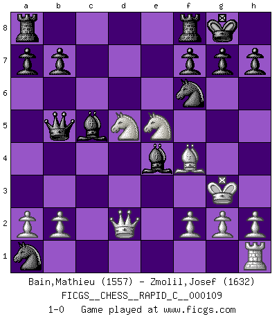 Last move : 1-0 2013 May 18 10:51:37 [Event "FICGS__CHESS__RAPID_C__000109"] [Site "FICGS"] [Date "2013.01.13"] [Round "1"] [White "Bain,Mathieu"] [Black "Zmolil,Josef"] [Result "1-0"] [WhiteElo "1557"] [BlackElo "1632"] 1.e4 c5 2.Nf3 Nc6 3.Bc4 e6 4.d4 d5 5.exd5 exd5 6.Bb5 Nf6 7.Ne5 Qb6 8.Qe2 Be6 9.dxc5 Bxc5 10.Bf4 O-O 11.Nc3 Nd4 12.Qd3 Bf5 13.Qd2 Nxc2+ 14.Ke2 Nxa1 15.Nxd5 Qxb5+ 16.Kf3 Be4+ 17.Kg3 1-0 This chess game has been lost on time (started : 2013.01.13 18:6:21) Sicilian defense Kingside Castling by player Black (move 10) Player White won this chess game. Follow this game move after move (download)All my games are real. (Bobby Fischer) Als ich elf wurde, wurde ich einfach gut. (Robert James Fischer) Fischer es una tragedia del Ajedrez Americano a la par con Morphy y Pillsbury. (Mig Greengard) Les échecs, c'est la lutte contre l'erreur. (Johannes Zukertort) Chess is as much a mystery as women. (Purdy)