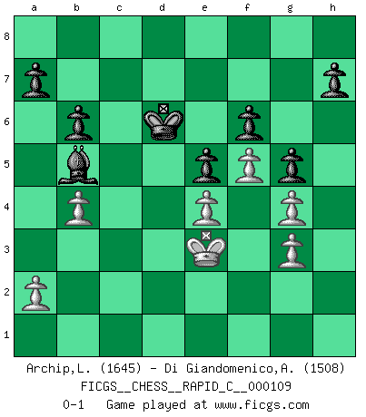Last move : 0-1 2013 February 19 20:53:3 [Event "FICGS__CHESS__RAPID_C__000109"] [Site "FICGS"] [Date "2013.01.13"] [Round "1"] [White "Archip,Laurentiu"] [Black "Di Giandomenico,Alfonso"] [Result "0-1"] [WhiteElo "1645"] [BlackElo "1508"] 1.c4 e6 2.d4 Nf6 3.Nc3 Bb4 4.Bd2 O-O 5.Nf3 b6 6.e3 Bb7 7.Be2 d5 8.cxd5 Bxc3 9.Bxc3 Nxd5 10.Bd2 Nf6 11.O-O Nbd7 12.Qc2 c5 13.dxc5 Nxc5 14.Bb4 Nfe4 15.Bxc5 Nxc5 16.Rfd1 Qf6 17.Nd4 Be4 18.Qc4 Rad8 19.b4 Na4 20.Nc6 Rxd1+ 21.Rxd1 Nc3 22.Re1 Nxe2+ 23.Qxe2 Bxc6 24.Rc1 Bb7 25.h3 Qg5 26.Qg4 Qxg4 27.hxg4 Rc8 28.Rxc8+ Bxc8 29.f4 f6 30.Kf2 Kf7 31.g3 e5 32.f5 g5 33.e4 Bd7 34.Ke3 Ke7 35.Kd3 Bb5+ 36.Ke3 Kd6 0-1 English Opening Kingside Castling by player Black (move 4) Kingside Castling by player White (move 11) Player Black won this chess game. Follow this game move after move (download)Half the variations which are calculated in a tournament game turn out to be completely superfluous. Unfortunately, no one knows in advance which half. (Jan Tinman) Der 70jährige Viktor Kortschnoi: Die Rentenanstalt wollte mich zwingen in Rente zu gehen. Meine Frau erhält jetzt eine Pension- und ich zahle weiter in die Rentenkasse ein! (Viktor Kortschnoi) Ayuda a tus piezas para que ellas te puedan ayudar. (Paul Morphy) Pour moi, les échecs ne sont pas un jeu mais un art. (Alexandre Alekhine) When you have everything, sometimes it feels like nothing. (Horatio Caine, C.S.I. Miami)