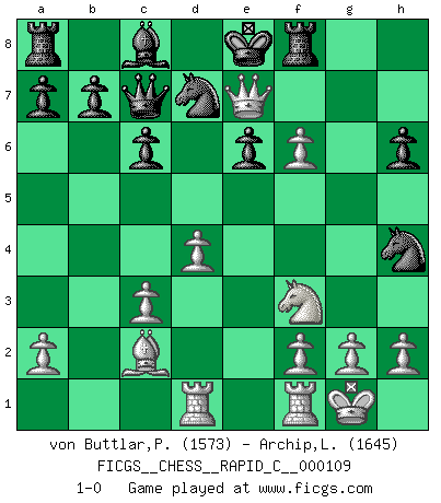 Last move : 1-0 2013 February 23 13:43:7 [Event "FICGS__CHESS__RAPID_C__000109"] [Site "FICGS"] [Date "2013.01.13"] [Round "1"] [White "von Buttlar,Paul"] [Black "Archip,Laurentiu"] [Result "1-0"] [WhiteElo "1573"] [BlackElo "1645"] 1.c4 d5 2.d4 dxc4 3.Nc3 Nf6 4.Nf3 e6 5.e3 Bb4 6.Bxc4 Bxc3+ 7.bxc3 O-O 8.O-O Nd5 9.Qc2 Nd7 10.e4 N5f6 11.Bg5 h6 12.Bh4 c6 13.Rad1 Qc7 14.e5 Nd5 15.Bb3 Nf4 16.Qe4 Ng6 17.Bc2 f5 18.exf6 Nxh4 19.Qh7+ Kf7 20.Qxg7+ Ke8 21.Qe7+ 1-0 English Opening Kingside Castling by player Black (move 7) Kingside Castling by player White (move 8) Player White won this chess game. Follow this game move after move (download)In Chess, at least, the brave inherit the earth. (Edmar Mednis) Woher wissen wir, daß der Neanderthaler Blindschach gespielt hat? -- Bei Ausgrabungen wurden keine Schachbretter und Figuren gefunden. (Anonymous) Durante una competencia de Ajedrez, un Maestro de Ajedrez deberá ser una combinación de presa de caza y un Monge. (Alexander Alekhine) Ce qui caractérise les parties de combat, c'est que si le défenseur a constamment de difficiles problèmes à résoudre, l'attaquant doit chercher sans relâche de nouvelles possibilités d'attaque. (Koblentz) It's unlucky to be superstitious. (Dave Enteles)