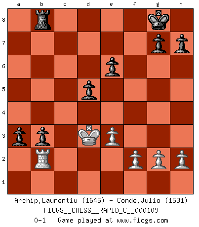 Last move : 0-1 2013 February 16 9:5:26 [Event "FICGS__CHESS__RAPID_C__000109"] [Site "FICGS"] [Date "2013.01.13"] [Round "1"] [White "Archip,Laurentiu"] [Black "Conde,Julio"] [Result "0-1"] [WhiteElo "1645"] [BlackElo "1531"] 1.c4 Nf6 2.d4 e6 3.Nc3 d5 4.cxd5 exd5 5.Nf3 Nc6 6.Bg5 Be7 7.e3 O-O 8.Bxf6 Bxf6 9.Be2 Be6 10.O-O a6 11.Na4 b5 12.Nc5 Na5 13.Nxe6 fxe6 14.Rc1 Rc8 15.Qd2 Nc4 16.Bxc4 bxc4 17.Qa5 Qd6 18.Rc3 Qb6 19.Qa3 c5 20.Rd1 cxd4 21.Nxd4 Bxd4 22.Rxd4 Rc5 23.b3 Ra5 24.Qb2 Qb4 25.Rd2 Rxa2 26.Qxa2 Qxc3 27.Qc2 Qxb3 28.Qxb3 cxb3 29.Rb2 Rb8 30.Kf1 a5 31.Ke2 a4 32.Kd3 a3 0-1 English, 1...Nf6 (Anglo-Indian defense) Kingside Castling by player Black (move 7) Kingside Castling by player White (move 10) Player Black won this chess game. Follow this game move after move (download)Bobby Fischer is the greatest Chess player who has ever lived. (Ken Smith) Es gibt Leute, die glauben, alles wäre vernünftig, was man mit einem ernsthaften Gesicht tut. (Georg Christoph Lichtenberg) Ser exitoso en el Ajedrez te permite descubrir tu propia personalidad. Eso es lo que deseo para los niños de mi clase. (Saudin Robovic) On n'a jamais que l'âge auquel on a commence à jouer aux échecs car après on cesse de vieillir. (Capablanca) Knowledge rests not upon truth alone, but upon error also. (Carl G. Jung)