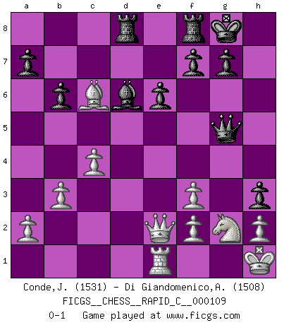 Last move : 0-1 2013 February 18 21:54:55 [Event "FICGS__CHESS__RAPID_C__000109"] [Site "FICGS"] [Date "2013.01.13"] [Round "1"] [White "Conde,Julio"] [Black "Di Giandomenico,Alfonso"] [Result "0-1"] [WhiteElo "1531"] [BlackElo "1508"] 1.d4 e6 2.e4 d5 3.Nc3 dxe4 4.Nxe4 Nd7 5.Nf3 Ngf6 6.Ng3 Be7 7.Bd3 O-O 8.O-O b6 9.c4 c5 10.Be3 Qc7 11.b3 Bb7 12.Qc2 Bxf3 13.gxf3 cxd4 14.Bxd4 Ne5 15.Bxe5 Qxe5 16.Be4 Rad8 17.Rae1 Qf4 18.Re2 h5 19.Rfe1 h4 20.Nf1 Nh5 21.Bc6 Qg5+ 22.Kh1 Nf4 23.Ne3 Nxe2 24.Qxe2 Bd6 25.Ng2 h3 0-1 Queen's pawn Kingside Castling by player Black (move 7) Kingside Castling by player White (move 8) Player Black won this chess game. Follow this game move after move (download)Chess is a matter of delicate judgment, knowing when to punch and how to duck. (Bobby Fischer) Ein Gewinn durch eine ungenaue Kombination, sei sie auch noch so vorzeigbar, erfüllt mich mit Schaudern. (Wilhelm Steinitz) El jugador blanco perdió porque fallo en recordar la coreccta continuación y tuvo que pensar por sí mismo las movidas. (Siegbert Tarrasch) Le jeu d'échecs fait naître et fortifie en nous plusieurs qualités précieuses dans le cours de l'existence, telles que la prévoyance, la circonspection, la prudence, et la persévérance. (Benjamin Franklin - 1783, la morale des échecs) The general who wins the battle makes many calculations in his temple before the battle is fought. The general who loses makes but few calculations beforehand. (Sun Tzu)