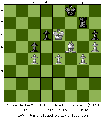 Last move : 1-0 2013 April 27 10:22:52 [Event "FICGS__CHESS__RAPID_SILVER__000102"] [Site "FICGS"] [Date "2013.01.14"] [Round "1"] [White "Kruse,Herbert"] [Black "Wosch,Arkadiusz"] [Result "1-0"] [WhiteElo "2424"] [BlackElo "2169"] 1.e4 c5 2.Nf3 Nc6 3.d4 cxd4 4.Nxd4 Nf6 5.Nc3 d6 6.Bg5 e6 7.Qd2 a6 8.Nxc6 bxc6 9.O-O-O Be7 10.Bxf6 gxf6 11.Bc4 Rb8 12.Rhe1 Qb6 13.Bb3 c5 14.Qe2 Kf8 15.Na4 Qc7 16.f4 Rg8 17.f5 a5 18.g4 Kg7 19.Nc3 Qb6 20.a4 Ba6 21.Nb5 Bxb5 22.axb5 Qxb5 23.Qxb5 Rxb5 24.fxe6 fxe6 25.Bxe6 Rgb8 26.b3 a4 27.bxa4 Rb4 28.Kd2 Rxa4 29.Ke3 Ra3+ 30.Rd3 Ra7 31.h4 h6 32.Kf4 Rb5 33.Rf1 Bd8 34.c4 R5b7 35.Kf5 Be7 36.R3d1 Rb3 37.Bd5 Bf8 38.Ra1 Rf3+ 39.Rxf3 Rxa1 40.Rb3 Ra7 41.Rb8 Rd7 42.h5 Re7 43.Be6 Rc7 44.Rxf8 Kxf8 45.Kxf6 Re7 46.Bf5 Rg7 47.Ke6 1-0 Sicilian defense Queenside Castling by player White (move 9) Player White won this chess game. Follow this game move after move (download)To avoid losing a piece, many a person has lost the game. (Savielly Tartakover) Wer nie einen Fehler gemacht hat, hat nie etwas Neues ausprobiert. (Albert Einstein) Las Aperturas te enseñan aperturas. ¡Los Finales te enseñan Ajedrez!. (Stephan Gerzadowicz) Il n'y a pas eu de défaite parce que je ne crois pas que cet ordinateur ait jamais existé. IBM a triché en refusant d'imprimer les modes de recherche de la machine. C'est évident, pendant le match, des coups décisifs ont été joués par des êtres humains. Aujourd'hui, les meilleurs spécialistes en informatique ne peuvent toujours pas expliquer comment Deep-Blue a pu jouer contre la logique des ordinateurs. IBM a gagné une guerre de communication, mais ils sont incapables de prouver que l'ordinateur a gagné tout seul. (Garry Kasparov) Games, world of games... There's always an opponent, and there's always a victim. (Revolver, movie)