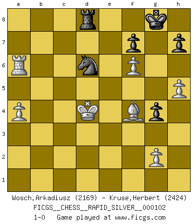 Last move : 1-0 2013 May 7 12:33:22 [Event "FICGS__CHESS__RAPID_SILVER__000102"] [Site "FICGS"] [Date "2013.01.14"] [Round "2"] [White "Wosch,Arkadiusz"] [Black "Kruse,Herbert"] [Result "1-0"] [WhiteElo "2169"] [BlackElo "2424"] 1.e4 c6 2.d4 d5 3.Nc3 dxe4 4.Nxe4 Nf6 5.Nxf6+ exf6 6.c3 Bd6 7.Bd3 O-O 8.Qc2 Re8+ 9.Ne2 g6 10.h4 Nd7 11.h5 Nf8 12.Bh6 Be6 13.O-O-O Qd7 14.Kb1 b5 15.Qd2 Bc4 16.Bxc4 bxc4 17.Ng3 Bxg3 18.fxg3 Qf5+ 19.Qc2 Qxc2+ 20.Kxc2 Nd7 21.b3 g5 22.bxc4 Nb6 23.Kd3 Na4 24.Rb1 Re6 25.Rb4 Nb6 26.Rf1 Rae8 27.Rf3 c5 28.Rb2 Re1 29.Rbf2 Nd7 30.Kc2 R1e4 31.Rd2 Re1 32.Rf5 cxd4 33.cxd4 Rh1 34.g4 Nb6 35.Rc5 Ra1 36.Kd3 Rd8 37.Rf2 Rd1+ 38.Ke2 Na4 39.Kxd1 Nxc5 40.d5 Ne4 41.Rf3 Rc8 42.Kc2 Rxc4+ 43.Kd3 Rb4 44.a3 Ra4 45.Re3 f5 46.gxf5 Nd6 47.Re7 Ra5 48.f6 Rxd5+ 49.Ke2 a6 50.a4 g4 51.Ra7 Re5+ 52.Kd3 Rd5+ 53.Kc3 Rc5+ 54.Kd4 Rc8 55.Bf4 Rd8 56.Rxa6 1-0 Caro-Kann : Tartakower (Nimzovich) variation Kingside Castling by player Black (move 7) Queenside Castling by player White (move 13) Player White won this chess game. Follow this game move after move (download)I prefer to lose a really good game than to win a bad one. (David Levy) Moralische Siege zählen nicht. (Savielly Grigorievitsch Tartakower) Cuando me preguntan: -¿Cual es el secreto que te hace hacer mejores movidas que tus oponentes?, Yo respondo: Me da gusto que me pregunten eso, porque, como veran, hay una simple razón. Yo pienso mis propias movidas y dejo a mi oponente que el piense las suyas. (Alexander Alekhine) Mon pion favori sur ma case favorite ! Bronstein en parlant d'un coup de pion en h5 quand il avait les Noirs. Everybody lies. (Gregory House, House M.D.)