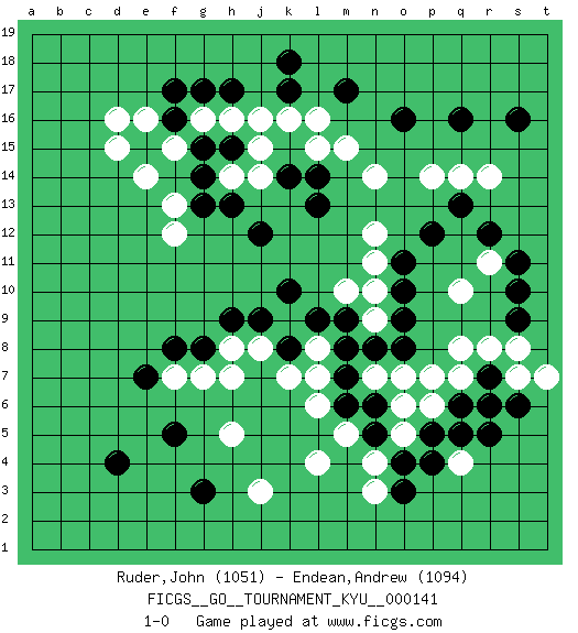 Last move : 1-0 2013 April 16 19:13:44 [Event "FICGS__GO__TOURNAMENT_KYU__000141"] [Site "FICGS"] [Date "2013.01.14"] [Round "1"] [Black "Ruder,John"] [White "Endean,Andrew"] [Result "1-0"] [Rating 1 "1051"] [Rating 2 "1094"] 1.q16 d16 2.d4 q4 3.k10 r14 4.r12 p14 5.o16 n14 6.p12 q10 7.s16 n12 8.o11 n11 9.o10 n10 10.o9 q8 11.q6 r6 12.r7 q7 13.r5 r8 14.s6 p6 15.p5 o6 16.q5 o5 17.o4 n4 18.o3 n3 19.n5 m5 20.n6 n7 21.m6 l6 22.m7 n9 23.q13 q14 24.n8 o7 25.o8 p7 26.m9 l4 27.p4 s7 28.r6 t7 29.s9 s8 30.s10 r11 31.s11 l7 32.m8 m10 33.k8 l8 34.l9 j3 35.g3 h5 36.f5 h7 37.g8 h8 38.h9 g7 39.f8 f7 40.e7 j8 41.j9 k7 42.l13 m15 43.m17 l16 44.k18 j16 45.h17 h16 46.g17 g16 47.f16 f15 48.e15 e16 49.f17 e14 50.g15 d15 51.g14 j14 52.j12 f12 53.h13 h14 54.g13 f13 55.k17 k16 56.l14 l15 57.h15 j15 58.k14 1-0 Here are the names of the openings (joseki) played in the four corners : Corner q16 : q16 r14 Hoshi (Hwajeom, Seongjeom, Xingwei`) 4-4 Point. The star or hoshi (4-4) point, emphasizing influence at the potential expense of territory. Ikken Kakari (Hankan Keolch'im, Yi Gua`jiao~, 1-Space Low Approach). White 2 is the standard approach move to the 4-4. Corner q4 : q4 o9 Hoshi (Hwajeom, Seongjeom, Xingwei`) 4-4 Point. The star or hoshi (4-4) point, emphasizing influence at the potential expense of territory. Corner d4 : d4 j3 Hoshi (Hwajeom, Seongjeom, Xingwei`) 4-4 Point. The star or hoshi (4-4) point, emphasizing influence at the potential expense of territory. Player Black won this Go (weiqi, baduk) game. Follow this game move after move (download)You don't have to be really good anymore to get good results. What's happening with chess is that it's gradually losing its place as the par excellence of intellectual activity. Smart people in search of a challenging board game might try a game called Go. (Hans Berliner, The New York Times, 2003) History is a gallery of pictures in which there are few originals and many copies. (Alexis de Tocqueville)