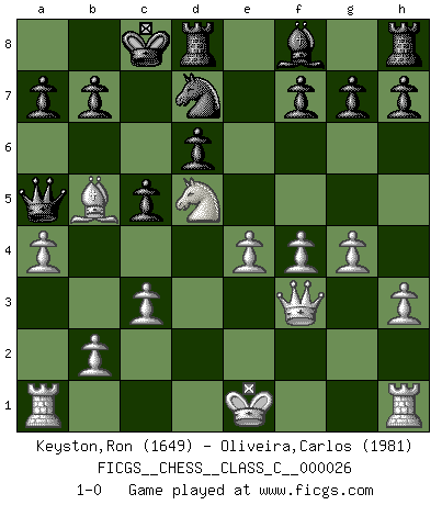 Last move : 1-0 2007 February 14 15:51:13 [Event "FICGS__CHESS__CLASS_C__000026"] [Site "FICGS"] [Date "2007.01.24"] [Round "1"] [White "Keyston,Ron"] [Black "Oliveira,Carlos"] [Result "1-0"] [WhiteElo "1649"] [BlackElo "1981"] 1.e4 c6 2.d4 d6 3.f4 Qc7 4.Nf3 Bg4 5.h3 Bxf3 6.Qxf3 e5 7.Be3 Nf6 8.Nc3 Nbd7 9.g4 exd4 10.Bxd4 c5 11.Bxf6 Nxf6 12.Bb5+ Nd7 13.Nd5 Qa5+ 14.c3 O-O-O 15.a4 1-0 Caro-Kann defense Queenside Castling by player Black (move 14) Player White won this chess game. Follow this game move after move (download)Suddenly it was obvious to me in my analysis I had missed what Fischer had found with the greatest of ease at the board. (Mikhail Botvinnik) Intelligenz läßt sich nicht am Weg, sondern nur am Ergebnis feststellen. (Garry Kasparov) ¡Examina movidas que hagan daño! Un buen ojo for movidas desvastantes es mucho mas importante que el conocimiento de principios estratégicos. (Purdy) Dieu déplace le joueur, et celui-ci la pièce. Quel Dieu derrière Dieu commence donc la trame ? Arturo Perez-Reverte (prix de littérature policière 1993). What doesn't kill us makes us stronger. (Friedrich Nietzsche)