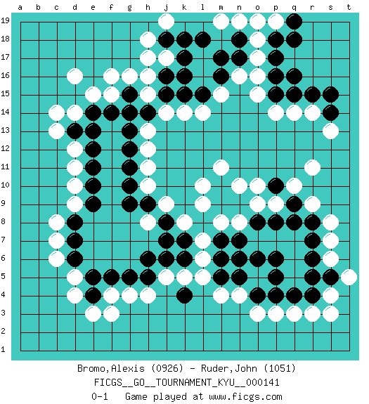 Last move : 0-1 2013 March 15 6:8:6 [Event "FICGS__GO__TOURNAMENT_KYU__000141"] [Site "FICGS"] [Date "2013.01.14"] [Round "1"] [Black "Bromo,Alexis"] [White "Ruder,John"] [Result "0-1"] [Rating 1 "0926"] [Rating 2 "1051"] 1.q16 d4 2.q4 d16 3.k16 o3 4.k4 o5 5.p6 m4 6.m6 l5 7.k6 l6 8.n6 l7 9.k7 n8 10.m7 m8 11.o6 k8 12.j8 k5 13.j6 j5 14.h6 f3 15.f5 g4 16.h5 h4 17.g5 c7 18.d8 c8 19.d7 c6 20.d6 d9 21.e9 d10 22.e10 d11 23.e11 d12 24.e12 c14 25.e14 r14 26.r15 q14 27.q15 q10 28.p8 p9 29.o8 o9 30.n9 l10 31.m9 l9 32.m10 m11 33.q9 r9 34.q8 r11 35.p10 o10 36.p5 r3 37.r4 q3 38.p4 p3 39.o4 j9 40.h9 h8 41.j7 h10 42.g9 h11 43.g11 h12 44.g12 h13 45.g13 k14 46.h14 j14 47.j15 h15 48.g14 f16 49.k15 l14 50.l15 m15 51.m16 n16 52.m17 o15 53.n17 o17 54.p17 o18 55.p18 h16 56.j16 j17 57.k17 h17 58.j18 h18 59.l18 j19 60.k18 m19 61.n18 n19 62.p16 o16 63.p15 p14 64.s14 s13 65.s15 s7 66.r7 s6 67.r6 s4 68.s5 t5 69.r5 s8 70.r8 s3 71.n7 n10 72.n5 n4 73.m5 d5 74.e5 f15 75.f14 d14 76.d13 c13 77.e13 p19 78.q19 o19 79.q18 e15 80.g15 g16 81.g10 f4 82.e4 e3 0-1 Here are the names of the openings (joseki) played in the four corners : Corner q4 : q4 o3 Hoshi (Hwajeom, Seongjeom, Xingwei`) 4-4 Point. The star or hoshi (4-4) point, emphasizing influence at the potential expense of territory. Ikken Kakari (Hankan Keolch'im, Yi Gua`jiao~, 1-Space Low Approach). White 2 is the standard approach move to the 4-4. Corner d4 : d4 j8 Hoshi (Hwajeom, Seongjeom, Xingwei`) 4-4 Point. The star or hoshi (4-4) point, emphasizing influence at the potential expense of territory. Corner q16 : q16 r14 Hoshi (Hwajeom, Seongjeom, Xingwei`) 4-4 Point. The star or hoshi (4-4) point, emphasizing influence at the potential expense of territory. Ikken Kakari (Hankan Keolch'im, Yi Gua`jiao~, 1-Space Low Approach). White 2 is the standard approach move to the 4-4. Player White won this Go (weiqi, baduk) game. Follow this game move after move (download)Ikken tobi is never wrong. (Anonymous) Luck is when opportunity knocks and you answer. (Anonymous)