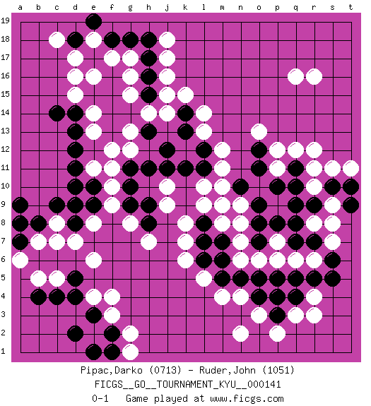 Last move : 0-1 2013 May 17 16:5:56 [Event "FICGS__GO__TOURNAMENT_KYU__000141"] [Site "FICGS"] [Date "2013.01.14"] [Round "1"] [Black "Pipac,Darko"] [White "Ruder,John"] [Result "0-1"] [Rating 1 "0713"] [Rating 2 "1051"] 1.d4 q16 2.q4 d16 3.c14 g17 4.e15 d15 5.d14 e14 6.f15 e13 7.f14 f17 8.d10 e11 9.e10 g12 10.f13 f12 11.d11 h14 12.h15 j15 13.h16 j16 14.h17 j17 15.h18 j18 16.h13 g13 17.g14 j14 18.e17 e16 19.f16 g16 20.g18 g15 21.f18 d17 22.d13 f10 23.j12 r6 24.k11 k7 25.q10 o3 26.p5 r3 27.r5 q3 28.p3 p2 29.p4 n2 30.o4 n4 31.n5 m4 32.m5 l5 33.l7 k8 34.l6 k6 35.l8 l9 36.m9 l10 37.l11 m10 38.n10 m11 39.h11 l13 40.k13 l14 41.l12 m12 42.g10 f9 43.g9 g8 44.h9 j10 45.j11 j9 46.h8 h7 47.g11 f11 48.k14 k15 49.d18 e18 50.e19 c18 51.d12 d7 52.d8 e8 53.e9 c8 54.d9 e6 55.c9 c7 56.a9 f3 57.e3 f4 58.d5 b5 59.b4 c5 60.c4 r16 61.f2 g2 62.e1 e4 63.d2 g1 64.f1 r12 65.b8 b7 66.a7 a6 67.a8 p11 68.p10 m8 69.m7 n9 70.o9 n7 71.m6 o6 72.o5 q6 73.o7 p7 74.o8 n8 75.s6 p6 76.q8 n6 77.s5 r4 78.q5 s7 79.r7 r8 80.q7 s9 81.s10 r11 82.p8 m9 83.r9 s8 84.t9 r10 85.q9 s11 86.t10 t11 87.q11 q12 88.o11 p12 89.o12 o13 0-1 Here are the names of the openings (joseki) played in the four corners : Corner d16 : d16 c14 Hoshi (Hwajeom, Seongjeom, Xingwei`) 4-4 Point. The star or hoshi (4-4) point, emphasizing influence at the potential expense of territory. Ikken Kakari (Hankan Keolch'im, Yi Gua`jiao~, 1-Space Low Approach). Black 2 is the standard approach move to the 4-4. Corner q4 : q4 r6 Hoshi (Hwajeom, Seongjeom, Xingwei`) 4-4 Point. The star or hoshi (4-4) point, emphasizing influence at the potential expense of territory. Ikken Kakari (Hankan Keolch'im, Yi Gua`jiao~, 1-Space Low Approach). White 2 is the standard approach move to the 4-4. Corner q16 : q16 l11 Hoshi (Hwajeom, Seongjeom, Xingwei`) 4-4 Point. The star or hoshi (4-4) point, emphasizing influence at the potential expense of territory. Corner d4 : d4 f9 Hoshi (Hwajeom, Seongjeom, Xingwei`) 4-4 Point. The star or hoshi (4-4) point, emphasizing influence at the potential expense of territory. Player White won this Go (weiqi, baduk) game. Follow this game move after move (download)Stop on second, extend on third. (Anonymous) But they are useless. They can only give you answers. (Pablo Picasso, about computers)