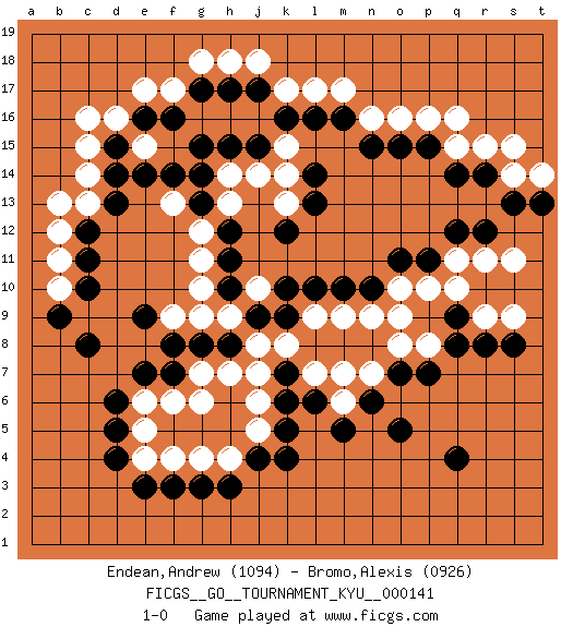 Last move : 1-0 2013 January 29 20:2:14 [Event "FICGS__GO__TOURNAMENT_KYU__000141"] [Site "FICGS"] [Date "2013.01.14"] [Round "1"] [Black "Endean,Andrew"] [White "Bromo,Alexis"] [Result "1-0"] [Rating 1 "1094"] [Rating 2 "0926"] 1.q4 d16 2.d4 q16 3.r14 r15 4.q14 q15 5.p15 p16 6.o15 o16 7.n15 n16 8.m16 m17 9.l16 l17 10.k16 k17 11.j17 j18 12.h17 h18 13.g17 g18 14.f16 e17 15.e16 f17 16.g15 e15 17.d15 c16 18.e14 c15 19.d14 c14 20.d13 c13 21.c12 b12 22.c11 b11 23.c10 b10 24.b9 b13 25.c8 s14 26.s13 s15 27.t13 t14 28.r12 q11 29.q12 r11 30.p11 p10 31.o11 o10 32.n10 n9 33.m10 m9 34.l10 l9 35.k9 k8 36.j9 j8 37.h8 h7 38.g8 g7 39.f7 f6 40.e7 e6 41.d6 e5 42.d5 e4 43.q8 q10 44.o7 o9 45.k6 j7 46.j4 m6 47.m5 l7 48.l6 m7 49.n6 n7 50.o5 o8 51.p7 p8 52.q9 r9 53.r8 s9 54.s8 s11 55.k7 g6 56.g3 j6 57.k5 j5 58.k4 h4 59.h3 g4 60.f3 f4 61.e3 h9 62.h10 g9 63.f8 f9 64.e9 g10 65.h11 g11 66.h12 g12 67.g13 f13 68.f14 h13 69.g14 h14 70.h15 j14 71.j15 k14 72.l13 k15 73.l14 k13 74.k12 j10 75.k10 1-0 Here are the names of the openings (joseki) played in the four corners : Corner q16 : q16 r14 Hoshi (Hwajeom, Seongjeom, Xingwei`) 4-4 Point. The star or hoshi (4-4) point, emphasizing influence at the potential expense of territory. Ikken Kakari (Hankan Keolch'im, Yi Gua`jiao~, 1-Space Low Approach). Black 2 is the standard approach move to the 4-4. Corner d16 : d16 j17 Hoshi (Hwajeom, Seongjeom, Xingwei`) 4-4 Point. The star or hoshi (4-4) point, emphasizing influence at the potential expense of territory. Corner q4 : q4 n9 Hoshi (Hwajeom, Seongjeom, Xingwei`) 4-4 Point. The star or hoshi (4-4) point, emphasizing influence at the potential expense of territory. Player Black won this Go (weiqi, baduk) game. Follow this game move after move (download)Knight's moves win running battles. (Anonymous) To steal ideas from one person is plagiarism. To steal from many is research. (Unknown)