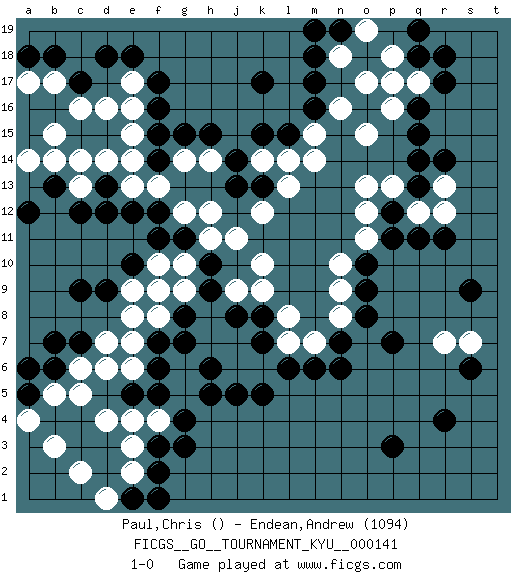 Last move : 1-0 2013 April 7 17:10:48 [Event "FICGS__GO__TOURNAMENT_KYU__000141"] [Site "FICGS"] [Date "2013.01.14"] [Round "1"] [Black "Paul,Chris"] [White "Endean,Andrew"] [Result "1-0"] [Rating 2 "1094"] 1.q16 d16 2.r4 d4 3.p3 o17 4.r14 o15 5.f17 e17 6.f16 d14 7.k17 q17 8.r17 p17 9.r18 p16 10.q15 o13 11.m17 n18 12.q11 q12 13.p12 p13 14.q13 r12 15.r11 r13 16.q14 o12 17.p11 o11 18.o10 n10 19.o9 n9 20.o8 n8 21.n7 m7 22.m6 l7 23.l6 k10 24.n6 k6 25.k5 j6 26.j5 g5 27.h6 h7 28.h5 g6 29.g4 f4 30.f3 e4 31.g3 e3 32.c12 c13 33.c9 d7 34.d12 f13 35.b7 c6 36.b6 b5 37.c17 c16 38.e18 e16 39.d18 b17 40.b18 a17 41.m18 m15 42.k15 l13 43.f12 e13 44.f11 g12 45.g11 h12 46.f2 e2 47.p7 e9 48.g7 h8 49.f7 e7 50.f5 f8 51.e1 d1 52.f1 c2 53.f6 e6 54.g8 g9 55.k7 j7 56.k8 l8 57.h9 k9 58.j8 j9 59.h10 j11 60.k13 k14 61.j14 l14 62.j13 k12 63.h15 g14 64.b13 b14 65.a12 a14 66.c7 c5 67.a5 a4 68.a6 b3 69.a18 b15 70.q18 p18 71.n19 o19 72.m19 r7 73.s6 s7 74.s9 g10 75.f9 f10 76.e10 f9 77.d9 e8 78.e12 h11 79.e5 d6 80.d13 c14 81.f15 e15 82.m16 n16 83.l15 m14 84.g15 h14 85.f14 e14 86.q19 1-0 Here are the names of the openings (joseki) played in the four corners : Corner q16 : q16 o17 Hoshi (Hwajeom, Seongjeom, Xingwei`) 4-4 Point. The star or hoshi (4-4) point, emphasizing influence at the potential expense of territory. Ikken Kakari (Hankan Keolch'im, Yi Gua`jiao~, 1-Space Low Approach). White 2 is the standard approach move to the 4-4. Corner d16 : d16 f17 Hoshi (Hwajeom, Seongjeom, Xingwei`) 4-4 Point. The star or hoshi (4-4) point, emphasizing influence at the potential expense of territory. Ikken Kakari (Hankan Keolch'im, Yi Gua`jiao~, 1-Space Low Approach). Black 2 is the standard approach move to the 4-4. Player Black won this Go (weiqi, baduk) game. Follow this game move after move (download)Strange things happen at the one-two points. (Anonymous) It is not enough to be a good player... you must also play well. (Siegbert Tarrasch)