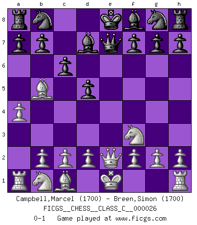 Last move : 0-1 2007 March 25 15:12:49 [Event "FICGS__CHESS__CLASS_C__000026"] [Site "FICGS"] [Date "2007.01.24"] [Round "1"] [White "Campbell,Marcel"] [Black "Breen,Simon"] [Result "0-1"] [WhiteElo "1700"] [BlackElo "1700"] 1.e4 e6 2.Nf3 d5 3.exd5 exd5 4.Bb5+ Bd7 5.a4 c6 6.Qe2+ Qe7 0-1 This chess game has been lost on time (started : 2007.01.24 15:56:56) French defense Player Black won this chess game. Follow this game move after move (download)The enormous mental resilience, without which no Chess player can exist, was so much taken up by Chess that he could never free his mind of this game. (Albert Einstein) Dieses schreckliche Gefühl, dass ich gegen eine Maschine spielte, die niemals Fehler macht, zerschmetterte meinen Widerstand. (Mark Taimanov) Solo los afeminados hacen el Enroque. (Rob Sillars) Le thème de l'attaque double intervient d'une manière ou d'une autre dans l'immense majorité des combinaisons. (Youri Averbakh) Experience is the name we all give to our mistakes. (Oscar Wilde)