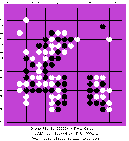 Last move : 0-1 2013 January 19 10:58:3 [Event "FICGS__GO__TOURNAMENT_KYU__000141"] [Site "FICGS"] [Date "2013.01.14"] [Round "1"] [Black "Bromo,Alexis"] [White "Paul,Chris"] [Result "0-1"] [Rating 1 "0926"] 1.q16 d4 2.q4 d17 3.g10 c15 4.g14 r14 5.k4 r6 6.q7 q6 7.p6 p5 8.p4 q5 9.o5 r4 10.o4 p7 11.o6 q8 12.o7 p8 13.o8 r3 14.q3 h3 15.j3 h4 16.j4 h5 17.h6 j5 18.k5 j6 19.k6 h7 20.g6 g7 21.f6 f7 22.e6 c6 23.e7 e8 24.j7 j8 25.k7 f9 26.g9 h8 27.g8 f8 28.d8 d7 29.d6 c7 30.d9 d5 31.k8 f10 32.f11 e11 33.e10 g11 34.h10 f12 35.d11 d12 36.h11 h12 37.j12 h13 38.j14 j13 39.k13 h14 40.h15 j15 41.k14 k15 42.g13 g12 43.f13 k12 44.j11 l13 45.l14 m14 0-1 Here are the names of the openings (joseki) played in the four corners : Corner q16 : q16 r14 Hoshi (Hwajeom, Seongjeom, Xingwei`) 4-4 Point. The star or hoshi (4-4) point, emphasizing influence at the potential expense of territory. Ikken Kakari (Hankan Keolch'im, Yi Gua`jiao~, 1-Space Low Approach). White 2 is the standard approach move to the 4-4. Corner q4 : q4 r6 Hoshi (Hwajeom, Seongjeom, Xingwei`) 4-4 Point. The star or hoshi (4-4) point, emphasizing influence at the potential expense of territory. Ikken Kakari (Hankan Keolch'im, Yi Gua`jiao~, 1-Space Low Approach). White 2 is the standard approach move to the 4-4. Player White won this Go (weiqi, baduk) game. Follow this game move after move (download)Do not fear furikawari. (Anonymous) He who defends everything defends nothing. (Frederick the Great)