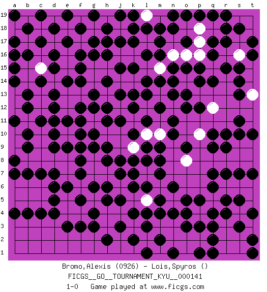 Last move : 1-0 2013 September 25 17:44:56 [Event "FICGS__GO__TOURNAMENT_KYU__000141"] [Site "FICGS"] [Date "2013.01.14"] [Round "1"] [Black "Bromo,Alexis"] [White "Lois,Spyros"] [Result "1-0"] [Rating 1 "0926"] 1.q16 p17 2.q17 q12 3.d4 h15 4.q4 r13 5.r15 p16 6.p15 o16 7.o15 n16 8.n15 m16 9.d10 m15 10.m14 k15 11.d16 g8 12.g6 l15 13.l14 k14 14.k13 s16 15.s15 l16 16.g10 f10 17.f11 f12 18.f9 e10 19.e11 d11 20.e9 f13 21.g12 g13 22.h12 h13 23.j13 j14 24.l13 e10 25.f10 g11 26.h11 h14 27.d12 q15 28.q14 p13 29.p14 e8 30.f8 o14 31.n14 e12 32.c11 j12 33.k12 l12 34.o13 p12 35.o12 o11 36.m12 p11 37.n11 n12 38.n13 m11 39.l11 g7 40.f7 f6 41.e6 e5 42.f5 k11 43.j11 p4 44.p3 p2 45.q3 r3 46.q2 q5 47.p5 p6 48.o4 o6 49.o5 n5 50.n4 n3 51.m4 m5 52.l4 l5 53.k4 k5 54.j5 j6 55.h5 j4 56.j3 h4 57.g4 e7 58.d6 c6 59.d5 e4 60.e3 q18 61.r18 m3 62.o3 c16 63.c17 c15 64.d15 d14 65.e14 c14 66.f14 g14 67.f15 g15 68.f16 f17 69.e17 d17 70.d18 g18 71.f18 e18 72.e19 d19 73.c19 c18 74.b18 b19 75.a19 j10 76.k10 h10 77.h9 j9 78.h8 m10 79.n10 n9 80.m9 n8 81.m8 g17 82.g16 l10 83.l9 n7 84.m7 m6 85.k6 h3 86.g3 f4 87.f3 e13 88.d13 q8 89.r4 j15 90.h16 k3 91.h2 j16 92.h17 l6 93.k7 c9 94.d9 o10 95.r5 o17 96.q6 p7 97.q7 o2 98.l3 d8 99.d7 c8 100.c7 p18 101.j17 k16 102.k17 l17 103.h18 j18 104.k18 l18 105.j19 l19 106.g19 g18 107.g17 l7 108.l8 c5 109.c4 r16 110.r17 s17 111.s18 o18 112.t17 r2 113.s3 s4 114.s5 r8 115.r7 s8 116.s7 h7 117.h6 l2 118.k2 r14 119.t16 b5 120.b4 b6 121.b7 n2 122.n6 q13 123.j7 o7 124.t4 s2 125.q1 r1 126.t2 s1 127.t1 k9 128.j8 p8 129.s14 n17 130.q19 s13 131.p19 s9 132.o19 m6 133.n19 m19 134.r19 c13 135.n18 c12 136.d11 a6 137.m18 a5 138.m17 t13 139.k19 e13 140.a7 b8 141.a4 t12 142.k8 b17 143.g9 c10 144.b10 f13 145.b9 g14 146.a8 a18 147.a17 g15 148.g13 h15 149.j15 j14 150.h14 k14 151.k15 b11 152.b16 b15 153.a15 b14 154.a14 a13 155.a16 t8 156.a11 a12 157.b12 l5 158.b13 d14 159.c14 q11 160.l6 s12 161.m5 o8 162.p1 o1 163.l1 r12 164.m2 t14 165.n1 n16 166.m16 c15 167.q10 o16 168.r10 p16 169.p10 o9 170.s10 m15 171.t10 m10 172.p9 r11 173.o17 l15 174.l16 m15 175.s11 t15 176.r9 p17 177.t9 p18 178.q9 t11 179.s10 s16 180.r10 p10 181.q10 k9 182.q9 p9 183.t10 t9 184.s11 l10 185.t7 e12 186.r9 q12 187.p12 p10 188.f12 t13 189.s13 o8 190.o9 l19 191.l18 1-0 Here are the names of the openings (joseki) played in the four corners : Corner q16 : q16 p17 Hoshi (Hwajeom, Seongjeom, Xingwei`) 4-4 Point. The star or hoshi (4-4) point, emphasizing influence at the potential expense of territory. Corner d16 : h15 d16 This joseki is unknown. A weak or weird move has probably been played in this corner. Corner d4 : d4 g8 Hoshi (Hwajeom, Seongjeom, Xingwei`) 4-4 Point. The star or hoshi (4-4) point, emphasizing influence at the potential expense of territory. Corner q4 : q4 p4 Hoshi (Hwajeom, Seongjeom, Xingwei`) 4-4 Point. The star or hoshi (4-4) point, emphasizing influence at the potential expense of territory. Player Black won this Go (weiqi, baduk) game. Follow this game move after move (download)When your opponent has two weak groups, attack them both at once. (Anonymous) The quality of decision is like the well-timed swoop of a falcon which enables it to strike and destroy its victim. (Sun Tzu)