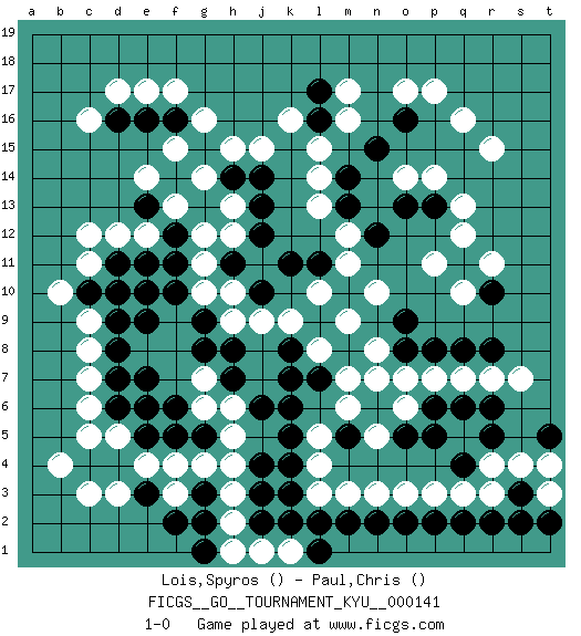 Last move : 1-0 2013 June 27 14:8:37 [Event "FICGS__GO__TOURNAMENT_KYU__000141"] [Site "FICGS"] [Date "2013.01.14"] [Round "1"] [Black "Lois,Spyros"] [White "Paul,Chris"] [Result "1-0"] 1.d4 q16 2.d9 q3 3.p2 p3 4.k6 c16 5.q2 o3 6.o2 n3 7.n2 m3 8.r2 r3 9.s2 q10 10.q4 r4 11.r5 r7 12.s3 s4 13.o5 m6 14.m2 l3 15.k3 f3 16.l2 c3 17.k2 d3 18.k4 l5 19.e3 e4 20.e5 f4 21.f5 c6 22.d6 c7 23.g8 e17 24.h11 o17 25.m5 n5 26.p5 o6 27.k5 r15 28.l7 m7 29.m8 n8 30.e6 m9 31.l9 l8 32.f6 m12 33.e7 k16 34.d16 d17 35.e16 f17 36.m10 n10 37.f16 g16 38.g15 h15 39.h14 j15 40.j14 g14 41.n6 n7 42.o8 f15 43.d7 c8 44.k11 l14 45.d8 c9 46.d10 d12 47.d11 c12 48.m14 l13 49.n15 l10 50.j12 c11 51.e9 h2 52.l11 m11 53.o16 p17 54.m13 m16 55.r6 s7 56.r8 q7 57.e11 k9 58.o9 q12 59.j2 h3 60.j3 h4 61.j4 h5 62.e10 t3 63.t2 t4 64.t5 e12 65.f12 f13 66.g3 g4 67.g5 h6 68.h7 g12 69.f11 g11 70.c4 b4 71.k7 h10 72.c10 b10 73.f10 j9 74.j10 h12 75.g13 h13 76.j13 g10 77.g9 h9 78.h8 j1 79.l16 l15 80.l17 m17 81.n12 o14 82.q11 r11 83.r10 p11 84.k8 c5 85.o13 p14 86.p13 q13 87.q8 p7 88.p6 o7 89.q6 l4 90.p8 d5 91.e13 e14 92.g2 k1 93.l1 h1 94.g1 g6 95.j6 g7 96.f2 1-0 Here are the names of the openings (joseki) played in the four corners : Corner q4 : q3 p2 Komoku (Somok, Xiao~mu`) 3-4 Point. The komoku (3-4) point is the traditional corner enclosure move.. Player Black won this Go (weiqi, baduk) game. Follow this game move after move (download)Don't make territory near thickness. (Anonymous) Optimism is a variety of information deficit. Sometimes especially true for correspondence chess games. (Michael Aigner)