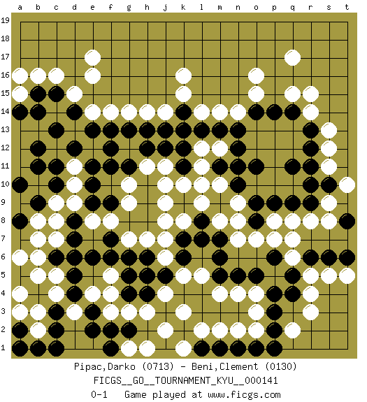 Last move : 0-1 2013 April 27 22:33:26 [Event "FICGS__GO__TOURNAMENT_KYU__000141"] [Site "FICGS"] [Date "2013.01.14"] [Round "1"] [Black "Pipac,Darko"] [White "Beni,Clement"] [Result "0-1"] [Rating 1 "0713"] [Rating 2 "0130"] 1.d4 c16 2.q4 q17 3.q11 r15 4.c11 d10 5.e9 f3 6.e3 f4 7.e2 e4 8.d5 k3 9.g5 h3 10.e11 d11 11.d12 c12 12.c10 d9 13.e10 c9 14.b11 c7 15.c13 b10 16.b12 c5 17.b9 b8 18.a10 c4 19.c3 e17 20.e6 b3 21.c2 b2 22.b1 b5 23.c6 b6 24.d6 a4 25.d8 c8 26.a8 a6 27.d7 b7 28.g4 g3 29.h4 j4 30.f2 f5 31.f6 o3 32.j5 k5 33.k6 j6 34.h6 j7 35.h5 h7 36.g6 l5 37.k7 k8 38.l7 j9 39.g8 m8 40.m7 n7 41.m6 q6 42.m5 m4 43.n5 n4 44.o5 p8 45.p9 q8 46.q9 n9 47.o8 o7 48.o9 n8 49.n10 m10 50.h9 j10 51.h10 r3 52.p4 r4 53.o11 k16 54.m11 r8 55.p6 p7 56.q5 r5 57.p3 q2 58.p2 o2 59.p1 o4 60.o1 m2 61.m1 l2 62.l1 j2 63.a2 o16 64.a1 e14 65.e13 f14 66.d14 d15 67.c15 b16 68.b15 e16 69.f13 g14 70.g13 h14 71.h13 j14 72.j13 l10 73.l8 l9 74.k11 k10 75.j1 h1 76.c1 a3 77.g2 k1 78.n1 n2 79.h8 j8 80.r9 l14 81.l13 m14 82.m13 s8 83.r6 q7 84.s6 s5 85.t6 t5 86.t8 s9 87.s10 s11 88.r11 t10 89.r10 s12 90.r12 s13 91.r13 r14 92.q14 q15 93.p14 o15 94.o14 n14 95.n13 j11 96.j12 h11 97.g11 g7 98.f7 g12 99.h12 g10 100.f11 f8 101.f12 a15 102.a14 a16 103.b14 l11 104.k12 m12 105.n11 l12 106.n12 e8 107.f9 g9 108.k14 k15 109.k13 g1 110.f1 d3 0-1 Here are the names of the openings (joseki) played in the four corners : Corner q16 : q17 q11 Komoku (Somok, Xiao~mu`) 3-4 Point. The komoku (3-4) point is the traditional corner enclosure move.. Corner d16 : c16 c11 Komoku (Somok, Xiao~mu`) 3-4 Point. The komoku (3-4) point is the traditional corner enclosure move.. Corner q4 : q4 o3 Hoshi (Hwajeom, Seongjeom, Xingwei`) 4-4 Point. The star or hoshi (4-4) point, emphasizing influence at the potential expense of territory. Ikken Kakari (Hankan Keolch'im, Yi Gua`jiao~, 1-Space Low Approach). White 2 is the standard approach move to the 4-4. Player White won this Go (weiqi, baduk) game. Follow this game move after move (download)Empty triangles are bad. (Anonymous) Art disturbs, science reassures. (Georges Braque, Le Jour et la Nuit)