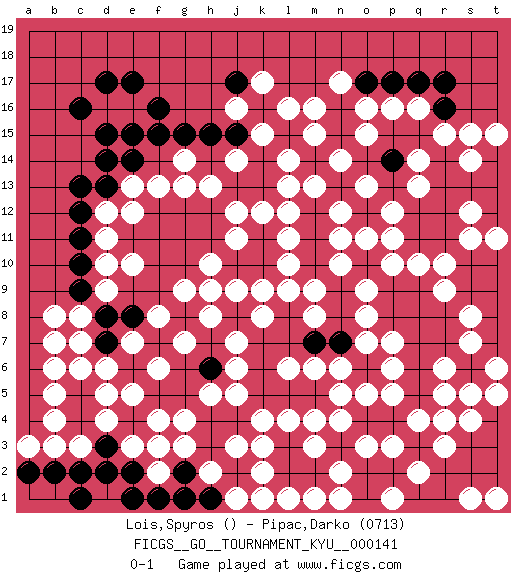 Last move : 0-1 2013 August 14 6:9:58 [Event "FICGS__GO__TOURNAMENT_KYU__000141"] [Site "FICGS"] [Date "2013.01.14"] [Round "1"] [Black "Lois,Spyros"] [White "Pipac,Darko"] [Result "0-1"] [Rating 2 "0713"] 1.d3 q16 2.k11 k4 3.k7 d16 4.g10 n10 5.k10 k12 6.k13 l12 7.m12 l11 8.m11 l10 9.m10 j12 10.h12 l9 11.l8 m9 12.k5 m8 13.k6 l13 14.m14 m13 15.k14 n12 16.l5 l4 17.l3 m4 18.m5 n4 19.o4 n5 20.h11 k9 21.r16 r15 22.d15 q4 23.q5 p5 24.q6 o3 25.o2 p3 26.p2 n2 27.r17 h9 28.f11 j9 29.d17 e16 30.d14 j11 31.l7 n6 32.n7 o7 33.p8 o8 34.q8 d6 35.d7 e7 36.c7 e5 37.d8 c6 38.a2 b6 39.e15 l14 40.l15 m15 41.b2 n14 42.l2 k15 43.j10 h10 44.g11 j14 45.j13 h13 46.e8 f8 47.f16 l16 48.e9 g9 49.f9 g7 50.e4 f4 51.f7 f6 52.g8 h8 53.j8 m6 54.m7 j5 55.c16 g14 56.f15 f13 57.e14 d12 58.f12 e12 59.e11 d11 60.c11 e13 61.f10 d10 62.c2 b8 63.j4 j6 64.h4 j7 65.q17 p16 66.f3 g4 67.h3 h5 68.n8 k8 69.j2 k3 70.e17 g3 71.n9 o9 72.o10 n11 73.n13 o13 74.r14 q14 75.r13 q13 76.c10 d9 77.q12 p12 78.q11 p10 79.k2 j3 80.m2 h2 81.p17 o16 82.p4 o5 83.c9 c8 84.n16 b7 85.p9 o11 86.q7 q10 87.r11 p6 88.q2 n1 89.o1 m1 90.q3 l1 91.g12 k1 92.p1 j1 93.d2 g13 94.c12 d4 95.c13 e3 96.o17 f2 97.c4 r3 98.r2 s4 99.s2 m3 100.e2 l6 101.g15 r10 102.q9 r9 103.r8 s8 104.r7 s7 105.s6 r5 106.e1 r6 107.c5 p7 108.f1 e10 109.h15 t6 110.g1 s5 111.s3 r4 112.t4 t5 113.t3 s11 114.r12 s12 115.s13 s14 116.t13 s15 117.t14 t15 118.t12 t11 119.n15 o15 120.p14 p11 121.d13 pass 122.j15 n17 123.m7 m16 124.k16 k17 125.q1 s1 126.r1 t1 127.t2 s1 128.h1 t1 129.h6 b5 130.d8 b4 131.o1 b3 132.o2 c3 133.c1 a3 134.p2 d5 135.d7 q2 136.n7 p1 137.g2 f3 138.e8 c7 139.j2 k2 140.j17 j16 0-1 This go game has been lost on time (started : 2013.01.14 19:17:34) Here are the names of the openings (joseki) played in the four corners : Corner q4 : l9 l8 This joseki is unknown. A weak or weird move has probably been played in this corner. Corner d4 : d3 h9 Komoku (Somok, Xiao~mu`) 3-4 Point. The komoku (3-4) point is the traditional corner enclosure move.. Player White won this Go (weiqi, baduk) game. Follow this game move after move (download)Add one stone, then sacrifice both. (Anonymous) Lottery : A tax on people who are bad at math. (Author unknown)