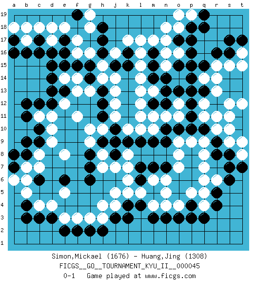 Last move : 0-1 2013 September 18 10:41:55 [Event "FICGS__GO__TOURNAMENT_KYU_II__000045"] [Site "FICGS"] [Date "2013.01.15"] [Round "1"] [Black "Simon,Mickael"] [White "Huang,Jing"] [Result "0-1"] [Rating 1 "1676"] [Rating 2 "1308"] 1.r16 d4 2.q3 d17 3.d15 f16 4.c17 c18 5.c16 e18 6.c12 q5 7.r5 r6 8.r4 q6 9.o3 r10 10.c6 f3 11.p17 k17 12.r12 c8 13.e6 e8 14.c3 c4 15.b4 b5 16.b3 b6 17.e2 e3 18.f2 g3 19.d3 e5 20.j3 n17 21.r8 q9 22.s8 q8 23.s6 n4 24.n3 m4 25.m3 j5 26.o5 n6 27.l4 l5 28.k4 k5 29.g6 h4 30.g8 d11 31.c10 c11 32.b11 d10 33.c9 d9 34.b8 c7 35.b12 g10 36.j9 j11 37.l9 l11 38.n9 m10 39.m9 k8 40.k9 o11 41.o6 o7 42.n7 m6 43.p7 o8 44.p8 o9 45.n10 n11 46.o10 p9 47.p10 q11 48.p11 q12 49.q10 r11 50.p12 r13 51.p13 o4 52.p6 q7 53.r9 s15 54.s16 r15 55.q15 q14 56.q13 s12 57.p14 r14 58.p15 n15 59.h17 j16 60.h16 h15 61.g15 g16 62.f15 h14 63.e16 f17 64.e17 g18 65.h18 b17 66.b16 a18 67.a16 o18 68.p18 f13 69.d14 h7 70.g7 h8 71.h11 h10 72.h9 g9 73.h12 j12 74.h13 j13 75.g14 g13 76.j15 j14 77.k15 l17 78.l7 k7 79.g2 h3 80.h2 j4 81.k3 b7 82.n13 m13 83.m12 l12 84.m14 l13 85.n14 l14 86.m15 l15 87.m16 m17 88.k16 l16 89.t11 s11 90.t10 s10 91.t9 t12 92.b9 p19 93.q19 o19 94.q18 t16 95.t17 t15 96.s17 s9 97.t7 t8 98.s7 t9 99.o17 n18 100.d12 e12 101.e13 e14 102.d13 f11 103.f19 g19 104.p4 p5 105.a7 a6 106.a8 n16 107.n12 m11 108.d16 d18 109.a17 b18 110.m7 n5 111.l6 k6 112.j8 j7 113.o15 o16 114.p16 o12 115.o13 q4 116.p3 f14 117.e15 k10 118.j10 l10 0-1 Here are the names of the openings (joseki) played in the four corners : Corner d16 : d17 d15 Komoku (Somok, Xiao~mu`) 3-4 Point. The komoku (3-4) point is the traditional corner enclosure move.. Ikken Takagakari (Hankan Nop'dakeolch'im, Yi Gaogua`jiao~, 1-Space High Approach). The 5-4 approach move has become more popular in modern times, as modern Go emphasizes speed and influence. Corner q4 : q3 q5 Komoku (Somok, Xiao~mu`) 3-4 Point. The komoku (3-4) point is the traditional corner enclosure move.. Ikken Takagakari (Hankan Nop'dakeolch'im, Yi Gaogua`jiao~, 1-Space High Approach). The 5-4 approach move has become more popular in modern times, as modern Go emphasizes speed and influence. Corner d4 : d4 c6 Hoshi (Hwajeom, Seongjeom, Xingwei`) 4-4 Point. The star or hoshi (4-4) point, emphasizing influence at the potential expense of territory. Ikken Kakari (Hankan Keolch'im, Yi Gua`jiao~, 1-Space Low Approach). Black 2 is the standard approach move to the 4-4. Player White won this Go (weiqi, baduk) game. Follow this game move after move (download)Don't be greedy ! (Anonymous) I have opinions of my own - strong opinions - but I don't always agree with them. (George Bush)