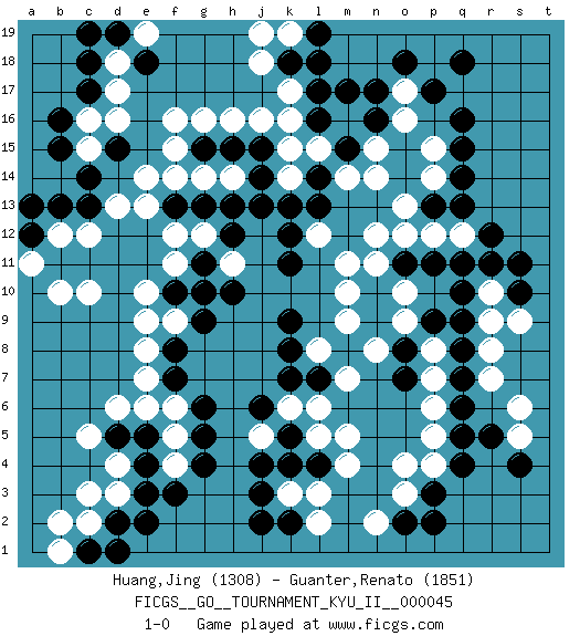 Last move : 1-0 2013 June 28 16:59:59 [Event "FICGS__GO__TOURNAMENT_KYU_II__000045"] [Site "FICGS"] [Date "2013.01.15"] [Round "1"] [Black "Huang,Jing"] [White "Guanter,Renato"] [Result "1-0"] [Rating 1 "1308"] [Rating 2 "1851"] 1.q16 d4 2.q4 d16 3.f3 d6 4.k4 o17 5.q14 k16 6.c14 f16 7.b16 c10 8.c17 d17 9.q10 o3 10.p3 o4 11.q6 k3 12.j3 l3 13.j4 m5 14.d2 c3 15.q18 r10 16.r11 r9 17.q11 s6 18.r5 s5 19.s4 r7 20.o2 n2 21.p2 p8 22.m17 m16 23.l17 k17 24.n17 o16 25.n16 p15 26.q15 n15 27.l16 l15 28.m15 m14 29.o18 n14 30.l14 k15 31.l13 n12 32.n10 m11 33.j13 e14 34.k11 m10 35.n9 m9 36.o7 n8 37.o8 o9 38.p9 o10 39.q8 p7 40.q7 p6 41.s10 c2 42.e3 p5 43.k9 d13 44.c13 c12 45.g10 e9 46.f8 e8 47.f7 f5 48.g5 f6 49.g6 e7 50.l7 m7 51.k18 j18 52.l18 j19 53.p17 l8 54.k8 l6 55.k7 f11 56.g11 f12 57.c18 d18 58.d19 e19 59.c19 c16 60.b15 b12 61.b13 p12 62.q13 h14 63.h13 g14 64.j15 j16 65.j14 h16 66.a12 a11 67.a13 b10 68.k2 l2 69.j2 r8 70.q9 k14 71.k13 f9 72.g9 k6 73.j6 j5 74.k5 l5 75.l4 m4 76.h15 g16 77.g15 f15 78.g13 f14 79.f10 e10 80.f13 e13 81.c1 b1 82.d1 d3 83.e2 b2 84.e4 f4 85.e5 e6 86.d5 c5 87.g4 g12 88.h12 h11 89.h10 p4 90.q5 k19 91.l19 q12 92.r12 s9 93.s11 l12 94.k12 p14 95.p13 o13 96.o11 n11 97.p11 o12 98.d15 c15 99.e18 1-0 Here are the names of the openings (joseki) played in the four corners : Corner d4 : d4 f3 Hoshi (Hwajeom, Seongjeom, Xingwei`) 4-4 Point. The star or hoshi (4-4) point, emphasizing influence at the potential expense of territory. Ikken Kakari (Hankan Keolch'im, Yi Gua`jiao~, 1-Space Low Approach). Black 2 is the standard approach move to the 4-4. Corner q16 : q16 o17 Hoshi (Hwajeom, Seongjeom, Xingwei`) 4-4 Point. The star or hoshi (4-4) point, emphasizing influence at the potential expense of territory. Ikken Kakari (Hankan Keolch'im, Yi Gua`jiao~, 1-Space Low Approach). White 2 is the standard approach move to the 4-4. Corner d16 : d16 c14 Hoshi (Hwajeom, Seongjeom, Xingwei`) 4-4 Point. The star or hoshi (4-4) point, emphasizing influence at the potential expense of territory. Ikken Kakari (Hankan Keolch'im, Yi Gua`jiao~, 1-Space Low Approach). Black 2 is the standard approach move to the 4-4. Corner q4 : q4 o3 Hoshi (Hwajeom, Seongjeom, Xingwei`) 4-4 Point. The star or hoshi (4-4) point, emphasizing influence at the potential expense of territory. Ikken Kakari (Hankan Keolch'im, Yi Gua`jiao~, 1-Space Low Approach). White 2 is the standard approach move to the 4-4. Player Black won this Go (weiqi, baduk) game. Follow this game move after move (download)In an unreasonable situation, an unreasonable move is reasonable. (Tamino) I would love to change the world, but they won't give me the source code. (Unknown)