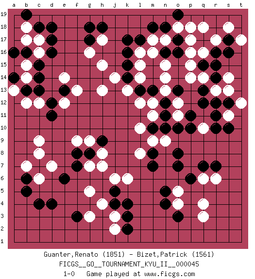 Last move : 1-0 2013 June 18 0:3:30 [Event "FICGS__GO__TOURNAMENT_KYU_II__000045"] [Site "FICGS"] [Date "2013.01.15"] [Round "1"] [Black "Guanter,Renato"] [White "Bizet,Patrick"] [Result "1-0"] [Rating 1 "1851"] [Rating 2 "1561"] 1.d4 q16 2.d16 q4 3.k4 q10 4.o16 p17 5.o17 r13 6.o3 q3 7.r7 r6 8.q7 q6 9.p6 c6 10.o7 c9 11.c4 c17 12.d17 c16 13.c15 b15 14.c14 b14 15.c13 h17 16.c18 b18 17.d18 h15 18.k17 h13 19.b19 b12 20.b13 a13 21.b16 b17 22.a16 c12 23.a14 g3 24.f3 g5 25.e6 g7 26.c7 d7 27.b6 b7 28.b5 c8 29.f7 h8 30.f8 j3 31.k3 j2 32.k2 e12 33.s16 r17 34.s17 s18 35.r16 q18 36.q15 o18 37.n18 n17 38.o19 p18 39.m18 p16 40.n16 q14 41.r14 p14 42.r12 s13 43.q12 s11 44.s12 t12 45.r10 o4 46.n4 o5 47.n5 k6 48.q13 s14 49.r15 p15 50.s10 t17 51.r11 l16 52.k16 l15 53.h18 m17 54.l17 m16 55.k15 l14 56.g17 g16 57.g18 o12 58.p11 o11 59.p10 n9 60.m7 l8 61.j4 h4 62.j5 j6 63.h9 g9 64.g8 h7 65.m8 m9 66.o8 f9 67.k14 k13 68.l13 n15 69.o10 j14 70.n10 m11 71.n11 m12 72.n12 n13 73.m10 l10 74.m13 l12 75.o13 n14 76.e13 f13 77.d12 e14 78.d11 1-0 Here are the names of the openings (joseki) played in the four corners : Corner q16 : q16 o16 Hoshi (Hwajeom, Seongjeom, Xingwei`) 4-4 Point. The star or hoshi (4-4) point, emphasizing influence at the potential expense of territory. Ikken Takagakari (Hankan Nop'dakeolch'im, Yi Gaojia, 1-Space High Approach). White typically responds at 6-4 or 3-10. White 4-10 is played when White finds play on the right side advantageous. White 4-8 or 3-8 may be played when White has support at top. Corner q4 : q4 o3 Hoshi (Hwajeom, Seongjeom, Xingwei`) 4-4 Point. The star or hoshi (4-4) point, emphasizing influence at the potential expense of territory. Ikken Kakari (Hankan Keolch'im, Yi Gua`jiao~, 1-Space Low Approach). Black 2 is the standard approach move to the 4-4. Corner d4 : d4 c6 Hoshi (Hwajeom, Seongjeom, Xingwei`) 4-4 Point. The star or hoshi (4-4) point, emphasizing influence at the potential expense of territory. Ikken Kakari (Hankan Keolch'im, Yi Gua`jiao~, 1-Space Low Approach). White 2 is the standard approach move to the 4-4. Corner d16 : d16 c17 Hoshi (Hwajeom, Seongjeom, Xingwei`) 4-4 Point. The star or hoshi (4-4) point, emphasizing influence at the potential expense of territory. Player Black won this Go (weiqi, baduk) game. Follow this game move after move (download)The poor player plays the opponent's game for him. (Anonymous) A specialist learns more and more about less and less until he knows everything about nothing. (Nicholas Murray Butler)
