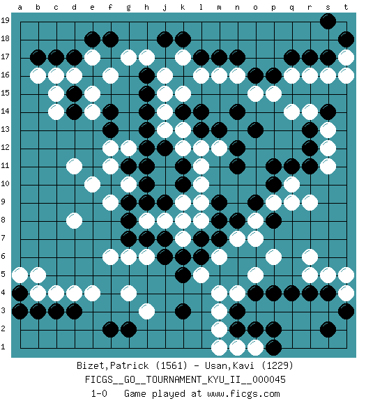 Last move : 1-0 2013 August 31 15:15:42 [Event "FICGS__GO__TOURNAMENT_KYU_II__000045"] [Site "FICGS"] [Date "2013.01.15"] [Round "1"] [Black "Bizet,Patrick"] [White "Usan,Kavi"] [Result "1-0"] [Rating 1 "1561"] [Rating 2 "1229"] 1.q4 d16 2.q17 c4 3.r11 e4 4.k16 d11 5.k3 r6 6.r4 r9 7.p11 q10 8.q11 r16 9.r17 q16 10.p16 p15 11.o16 q14 12.d3 d4 13.f2 g17 14.c3 d8 15.j18 m16 16.m17 l16 17.l17 n16 18.n17 o15 19.n11 n13 20.o9 p9 21.p10 o8 22.p8 q9 23.n8 o7 24.m9 p6 25.d14 c14 26.d15 c15 27.e16 f16 28.d17 c16 29.c17 e17 30.e18 e15 31.f18 k15 32.n3 m4 33.k11 m3 34.n2 m2 35.h11 g12 36.g11 f12 37.g8 h3 38.k5 n4 39.o4 o5 40.p4 n7 41.m7 m6 42.l6 l5 43.k6 g4 44.b3 b4 45.g2 j16 46.h12 f11 47.f10 e10 48.h13 k17 49.k18 f9 50.g9 g10 51.h10 h6 52.h7 f6 53.b17 b16 54.a4 a5 55.a3 b5 56.s14 s16 57.s17 t17 58.t18 t16 59.s19 s13 60.r13 s12 61.r12 r14 62.m13 m12 63.n12 l12 64.l13 k13 65.n14 k12 66.o13 l11 67.h14 l10 68.k14 j14 69.l14 j13 70.h15 j15 71.k10 l9 72.k8 l8 73.m8 k9 74.j9 k7 75.l7 j8 76.j7 k8 77.j6 h8 78.h16 h17 79.g7 g6 80.h9 n1 81.o2 o1 82.p1 m1 83.p2 s11 84.j12 s5 85.s4 t4 86.t3 t5 87.s2 r5 88.f14 e14 89.f13 1-0 Here are the names of the openings (joseki) played in the four corners : Corner q4 : q4 r6 Hoshi (Hwajeom, Seongjeom, Xingwei`) 4-4 Point. The star or hoshi (4-4) point, emphasizing influence at the potential expense of territory. Ikken Kakari (Hankan Keolch'im, Yi Gua`jiao~, 1-Space Low Approach). White 2 is the standard approach move to the 4-4. Player Black won this Go (weiqi, baduk) game. Follow this game move after move (download)... {it is} something unearthly... if there are sentient beings on other planets, then they play go. (Emanuel Lasker, chess world champion) Go and wake up your luck. (Persian saying)