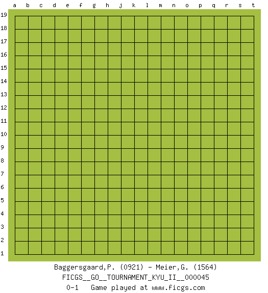 Last move : 0-1 2013 February 15 2:45:59 [Event "FICGS__GO__TOURNAMENT_KYU_II__000045"] [Site "FICGS"] [Date "2013.01.15"] [Round "1"] [Black "Baggersgaard,Poulerik"] [White "Meier,Gilles"] [Result "0-1"] [Rating 1 "0921"] [Rating 2 "1564"] 0-1 This go game has been lost on time (started : 2013.01.15 20:13:53) Here are the names of the openings (joseki) played in the four corners : Player White won this Go (weiqi, baduk) game. Follow this game move after move (download)Keep inessential ataris till the end. (Anonymous) Do you know these so called Volunteers don't even get paid! (Simpsons)
