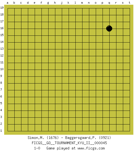 Last move : 1-0 2013 February 22 4:2:37 [Event "FICGS__GO__TOURNAMENT_KYU_II__000045"] [Site "FICGS"] [Date "2013.01.15"] [Round "1"] [Black "Simon,Mickael"] [White "Baggersgaard,Poulerik"] [Result "1-0"] [Rating 1 "1676"] [Rating 2 "0921"] 1.q16 1-0 This go game has been lost on time (started : 2013.01.15 20:13:53) Here are the names of the openings (joseki) played in the four corners : Player Black won this Go (weiqi, baduk) game. Follow this game move after move (download)Everything would seem to be possible in Go. Like pulling a rabbit, by a magical move, out of a hat. (Pierre Audouard) When it is a question of money, everybody is of the same religion. (Voltaire)