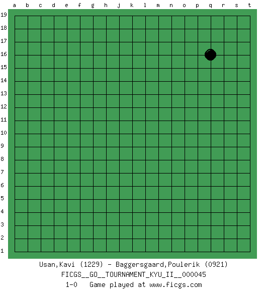 Last move : 1-0 2013 February 15 2:45:59 [Event "FICGS__GO__TOURNAMENT_KYU_II__000045"] [Site "FICGS"] [Date "2013.01.15"] [Round "1"] [Black "Usan,Kavi"] [White "Baggersgaard,Poulerik"] [Result "1-0"] [Rating 1 "1229"] [Rating 2 "0921"] 1.q16 1-0 This go game has been lost on time (started : 2013.01.15 20:13:53) Here are the names of the openings (joseki) played in the four corners : Player Black won this Go (weiqi, baduk) game. Follow this game move after move (download)White is always trying to kill a bigger group than black is trying to save. (Anonymous) Political correctness is subjecting us to gross incompetence. (Johann Piek)