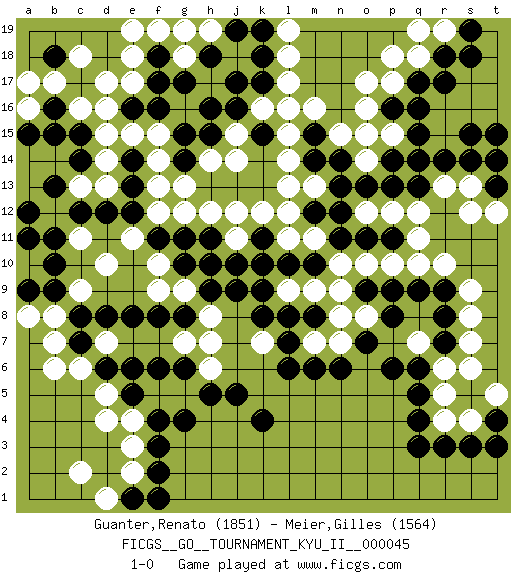 Last move : 1-0 2013 May 23 22:47:50 [Event "FICGS__GO__TOURNAMENT_KYU_II__000045"] [Site "FICGS"] [Date "2013.01.15"] [Round "1"] [Black "Guanter,Renato"] [White "Meier,Gilles"] [Result "1-0"] [Rating 1 "1851"] [Rating 2 "1564"] 1.q16 d4 2.q4 d16 3.f3 e3 4.f4 c6 5.k4 o17 6.r14 l17 7.f17 e17 8.f16 d14 9.j17 q18 10.r17 r6 11.q6 q7 12.p6 r4 13.r3 r5 14.q3 r10 15.c12 c13 16.d12 c9 17.e14 e15 18.g14 f14 19.e13 f15 20.g15 f13 21.b9 b8 22.b10 e2 23.c8 b7 24.d8 s12 25.r18 p18 26.k18 l18 27.c17 e18 28.b15 b14 29.c15 d13 30.e12 b12 31.b11 c16 32.b16 c18 33.b18 d17 34.a12 a13 35.a11 d15 36.b13 a14 37.c14 b12 38.r7 s7 39.b13 d10 40.a15 b17 41.r8 s8 42.r9 s9 43.q9 q10 44.p9 p10 45.o9 k7 46.k9 h7 47.d6 d5 48.e6 f10 49.h9 g9 50.g8 h8 51.f8 h10 52.j9 f12 53.g6 k12 54.k15 k16 55.j16 h19 56.h18 g18 57.f18 f19 58.g17 g19 59.j19 e19 60.k17 l16 61.m10 l19 62.k19 l15 63.f2 j15 64.h15 j14 65.e1 d1 66.f1 c2 67.s3 s4 68.t4 t5 69.t3 n9 70.m8 n10 71.l8 n8 72.m6 o10 73.o7 o8 74.p8 n7 75.n6 l9 76.k8 m7 77.l7 m9 78.k11 k10 79.j10 j11 80.l10 l11 81.k10 m11 82.h11 j12 83.g10 f9 84.f11 e11 85.g11 f5 86.f6 g5 87.e5 e4 88.h5 h12 89.l6 g12 90.h10 d7 91.e8 c11 92.c7 b6 93.a9 h14 94.p14 r19 95.s19 t14 96.s15 s13 97.t15 o15 98.o13 o14 99.p13 p15 100.q15 g13 101.h16 a17 102.n12 q12 103.n11 l12 104.n14 n15 105.m14 l14 106.m15 m16 107.p11 q11 108.q13 m13 109.n13 r13 110.p16 o16 111.m12 l13 112.s14 q19 113.s18 p12 114.o11 o12 115.q14 h6 116.j5 g7 117.g4 a8 118.q5 s6 119.q17 p17 120.t13 t12 121.t14 a16 122.e16 1-0 Here are the names of the openings (joseki) played in the four corners : Corner d4 : d4 f3 Hoshi (Hwajeom, Seongjeom, Xingwei`) 4-4 Point. The star or hoshi (4-4) point, emphasizing influence at the potential expense of territory. Ikken Kakari (Hankan Keolch'im, Yi Gua`jiao~, 1-Space Low Approach). Black 2 is the standard approach move to the 4-4. Corner q16 : q16 o17 Hoshi (Hwajeom, Seongjeom, Xingwei`) 4-4 Point. The star or hoshi (4-4) point, emphasizing influence at the potential expense of territory. Ikken Kakari (Hankan Keolch'im, Yi Gua`jiao~, 1-Space Low Approach). White 2 is the standard approach move to the 4-4. Corner d16 : d16 f17 Hoshi (Hwajeom, Seongjeom, Xingwei`) 4-4 Point. The star or hoshi (4-4) point, emphasizing influence at the potential expense of territory. Ikken Kakari (Hankan Keolch'im, Yi Gua`jiao~, 1-Space Low Approach). Black 2 is the standard approach move to the 4-4. Corner q4 : q4 r6 Hoshi (Hwajeom, Seongjeom, Xingwei`) 4-4 Point. The star or hoshi (4-4) point, emphasizing influence at the potential expense of territory. Ikken Kakari (Hankan Keolch'im, Yi Gua`jiao~, 1-Space Low Approach). White 2 is the standard approach move to the 4-4. Player Black won this Go (weiqi, baduk) game. Follow this game move after move (download)Territory really exists only in the end. (Pierre Audouard) I believe in luck. How else can you explain the success of those you dislike ? (Jean Cocteau)