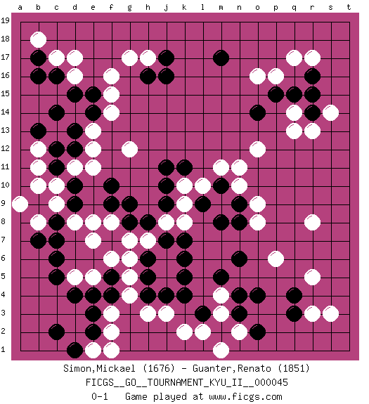 Last move : 0-1 2013 June 1 21:26:21 [Event "FICGS__GO__TOURNAMENT_KYU_II__000045 "] [Site "FICGS"] [Date "2013.01.15"] [Round "1"] [Black "Simon,Mickael "] [White "Guanter,Renato "] [Result "0-1"] [Rating 1 "1676"] [Rating 2 "1851"] 1.r16 d16 2.q3 p16 3.d4 r5 4.o4 r8 5.c14 f16 6.b16 c17 7.c11 q14 8.r14 r13 9.q15 s14 10.r15 q13 11.p15 o16 12.o14 q17 13.m17 r17 14.j17 h17 15.h16 g17 16.j16 j3 17.l3 f3 18.e3 s3 19.c6 r3 20.q4 d8 21.c8 c9 22.b9 b8 23.c7 b10 24.d9 c10 25.d10 b11 26.b7 a9 27.c12 b12 28.b13 e8 29.f4 d11 30.f9 f8 31.d12 e11 32.f10 e12 33.d13 e13 34.e14 f14 35.e15 f15 36.b17 b18 37.c16 d17 38.d15 g12 39.g8 g7 40.h8 f6 41.h6 h7 42.j7 j8 43.j9 k8 44.f7 e7 45.g9 k9 46.j10 j6 47.h5 g4 48.f5 j5 49.h4 h3 50.j4 g5 51.k4 g6 52.k7 e5 53.e4 d5 54.c5 f2 55.e2 e1 56.d1 f1 57.c2 k2 58.k5 l2 59.m2 m3 60.n3 m4 61.m5 n2 62.o2 m1 63.n4 p6 64.n6 o12 65.k6 o8 66.m8 m9 67.n8 o9 68.n9 k10 69.j11 n11 70.m10 m11 71.k11 n10 72.l9 l10 0-1 Here are the names of the openings (joseki) played in the four corners : Corner q16 : r16 p16Komoku (Somok, Xiao~mu`) 3-4 Point. The komoku (3-4) point is the traditional corner enclosure move..Ikken Takagakari (Hankan Nop'dakeolch'im, Yi Gaogua`jiao~, 1-Space High Approach). The 5-4 approach move has become more popular in modern times, as modern Go emphasizes speed and influence. Corner q4 : q3 r5Komoku (Somok, Xiao~mu`) 3-4 Point. The komoku (3-4) point is the traditional corner enclosure move..Ikken Kakari (Hankan Keolch'im, Yi Gua`jiao~, 1-Space Low Pincer). The small knight move is the basic approach move to the 3-4 point stone. It has been continually used for over four centuries. There are limitless variations, with new moves constantly being discovered. White 2 opens the door to a treaure store of joseki. Corner d16 : d16 c14Hoshi (Hwajeom, Seongjeom, Xingwei`) 4-4 Point. The star or hoshi (4-4) point, emphasizing influence at the potential expense of territory.Ikken Kakari (Hankan Keolch'im, Yi Gua`jiao~, 1-Space Low Approach). Black 2 is the standard approach move to the 4-4. Corner d4 : d4 j3Hoshi (Hwajeom, Seongjeom, Xingwei`) 4-4 Point. The star or hoshi (4-4) point, emphasizing influence at the potential expense of territory. Player White won this Go (weiqi, baduk) game.Follow this game move after move (download ) Avoid the plate connection. (Anonymous) It's not enough to succeed. Others must fail. (Gore Vidal)