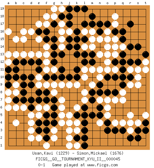 Last move : 0-1 2013 October 1 17:3:38 [Event "FICGS__GO__TOURNAMENT_KYU_II__000045"] [Site "FICGS"] [Date "2013.01.15"] [Round "1"] [Black "Usan,Kavi"] [White "Simon,Mickael"] [Result "0-1"] [Rating 1 "1229"] [Rating 2 "1676"] 1.q16 d4 2.q3 r5 3.o4 q7 4.l4 r11 5.r14 d16 6.k16 j4 7.c14 f17 8.d10 c6 9.g4 h5 10.g5 h6 11.g6 h7 12.g7 g8 13.f8 f9 14.e8 e9 15.d9 h9 16.g10 g9 17.d7 r3 18.r2 q4 19.s3 r4 20.p3 j3 21.l3 o16 22.o17 p17 23.p16 p18 24.n17 o15 25.r17 m16 26.m17 l16 27.l17 k17 28.j17 k18 29.j18 j16 30.k15 l18 31.m18 h17 32.h18 h16 33.k14 m14 34.g14 c15 35.d14 g18 36.k19 p13 37.m13 l14 38.l13 n13 39.k13 g2 40.e3 d3 41.e4 e5 42.f5 e6 43.d6 d5 44.e7 f6 45.f7 e2 46.c7 b6 47.b7 a7 48.a8 b4 49.r12 q12 50.s12 s11 51.q11 p11 52.q10 r9 53.p10 o11 54.o10 m11 55.m10 n10 56.n9 n11 57.o8 f11 58.f10 e10 59.e11 f12 60.h10 j9 61.j10 k9 62.k10 l10 63.k11 m9 64.m8 l8 65.m7 l7 66.l6 k6 67.k5 m6 68.l5 j5 69.d15 c16 70.q13 o7 71.n6 n7 72.n8 o6 73.n5 o5 74.q9 n4 75.m5 p4 76.o3 d11 77.e12 e13 78.d12 d13 79.c12 c13 80.b14 e15 81.e14 c11 82.b12 f14 83.f15 f13 84.e16 e17 85.g15 b13 86.b11 b15 87.a14 a6 88.j15 b8 89.a9 b9 90.b10 a10 91.a11 s9 92.p12 s4 93.s2 t12 94.t13 t11 95.s14 o13 96.k2 q8 97.c9 p15 98.q15 j2 99.c8 a8 100.f3 g3 101.f2 f1 102.f4 d2 103.a15 a16 104.f16 h19 105.l19 h15 106.g17 h14 107.h13 a13 108.g13 e15 109.j14 a12 110.c10 f18 111.l15 m15 112.n16 n15 113.r10 s10 114.p8 p7 115.t4 t5 116.t3 k1 117.l1 j1 118.g12 k3 119.l2 g11 120.h11 o12 121.p14 o14 122.m12 l11 123.l12 q14 124.q12 h4 125.p14 g19 126.j19 q14 127.a9 p14 128.a10 k4 129.pass pass 0-1 Here are the names of the openings (joseki) played in the four corners : Corner q4 : q3 r5 Komoku (Somok, Xiao~mu`) 3-4 Point. The komoku (3-4) point is the traditional corner enclosure move.. Ikken Kakari (Hankan Keolch'im, Yi Gua`jiao~, 1-Space Low Pincer). The small knight move is the basic approach move to the 3-4 point stone. It has been continually used for over four centuries. There are limitless variations, with new moves constantly being discovered. White 2 opens the door to a treaure store of joseki. Corner q16 : q16 r11 Hoshi (Hwajeom, Seongjeom, Xingwei`) 4-4 Point. The star or hoshi (4-4) point, emphasizing influence at the potential expense of territory. Corner d16 : d16 c14 Hoshi (Hwajeom, Seongjeom, Xingwei`) 4-4 Point. The star or hoshi (4-4) point, emphasizing influence at the potential expense of territory. Ikken Kakari (Hankan Keolch'im, Yi Gua`jiao~, 1-Space Low Approach). Black 2 is the standard approach move to the 4-4. Player White won this Go (weiqi, baduk) game. Follow this game move after move (download)The strong player plays straight, the weak diagonally. (Anonymous) I find television to be very educating. Every time somebody turns on the set, I go in the other room and read a book. (Groucho Marx)